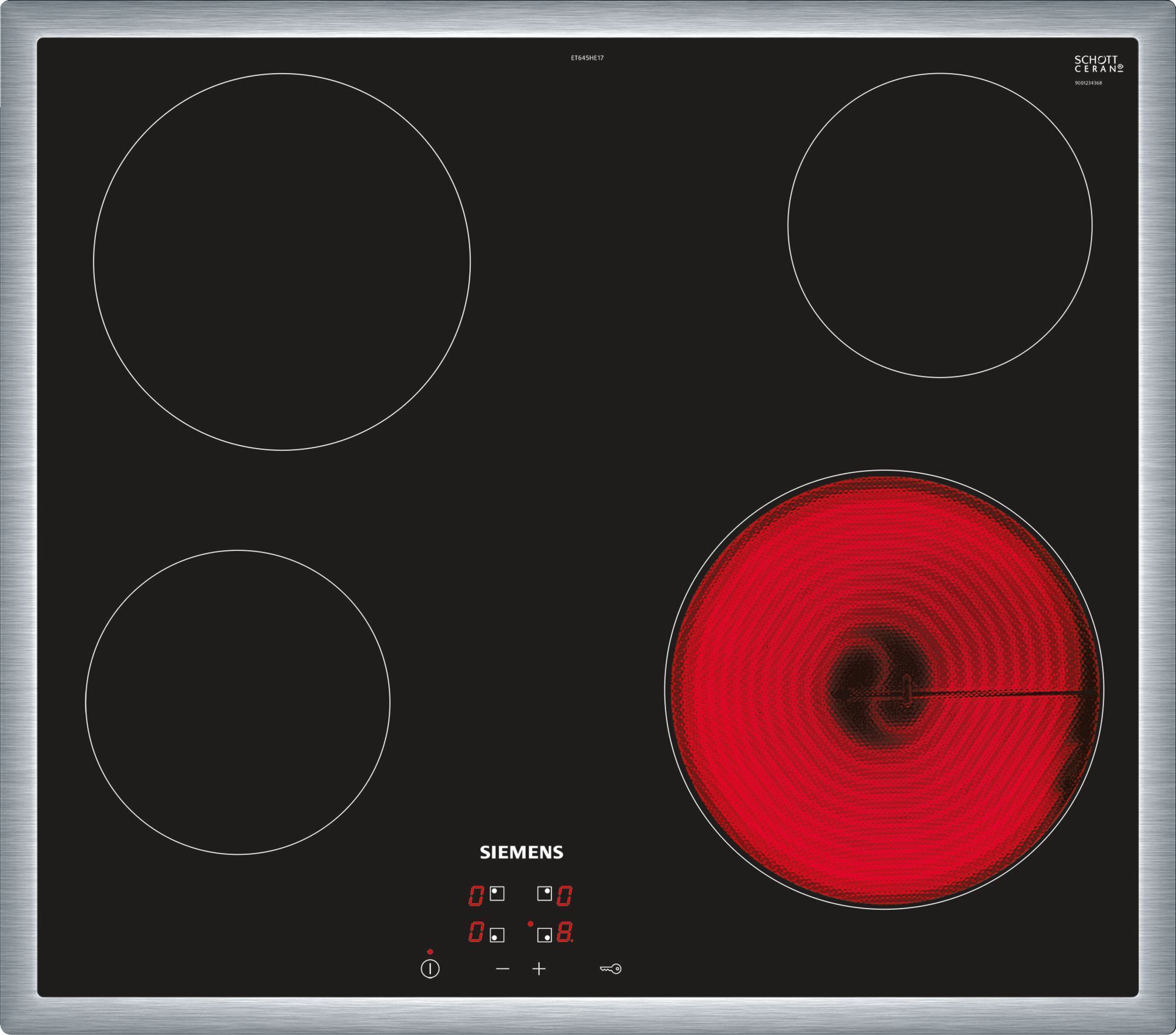 Siemens ceramic hob with four cooking zones and steel frame. An easy-to-use control panel lets you choose the power level you need from 17 different levels. In addition, a separate child lock creates safety.