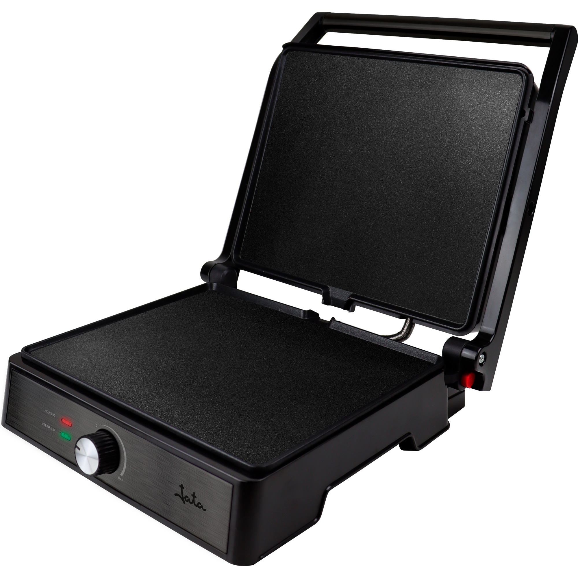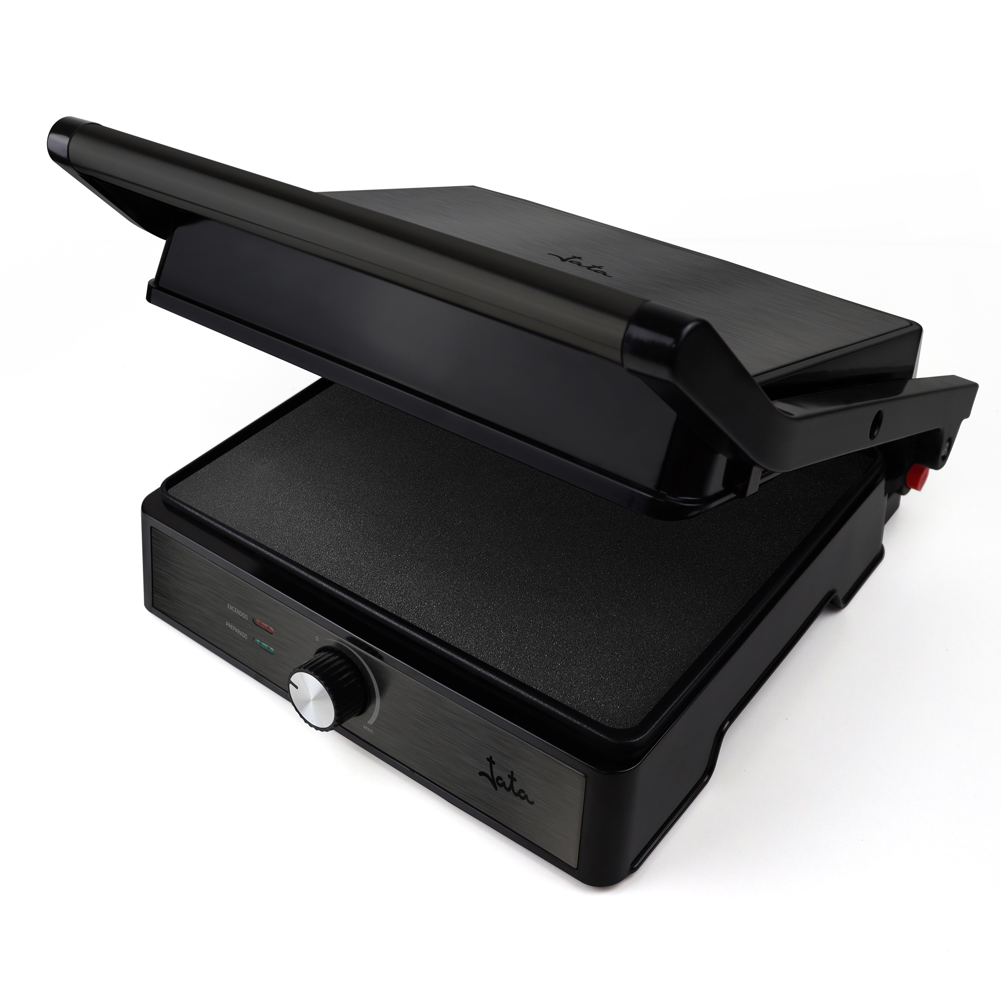 Jata JEGR1913 Contact grill Description The double grill has a tilting top plate that makes it special for cooking food of extra thickness and thanks to its 180º opening you can use it as a grill iron Features Non-stick coating free of PFOA Special floating hinge system on upper plate for the perfect cooking of extra volume foods 180º open as a grill Overheat safety protection Cold touch handles Uniform grill pressure 2 independent pilot lights: On / Ready Plates: 290 x 240 mm Sauce collecting tray Voltage 230 V Power 2.000 W
