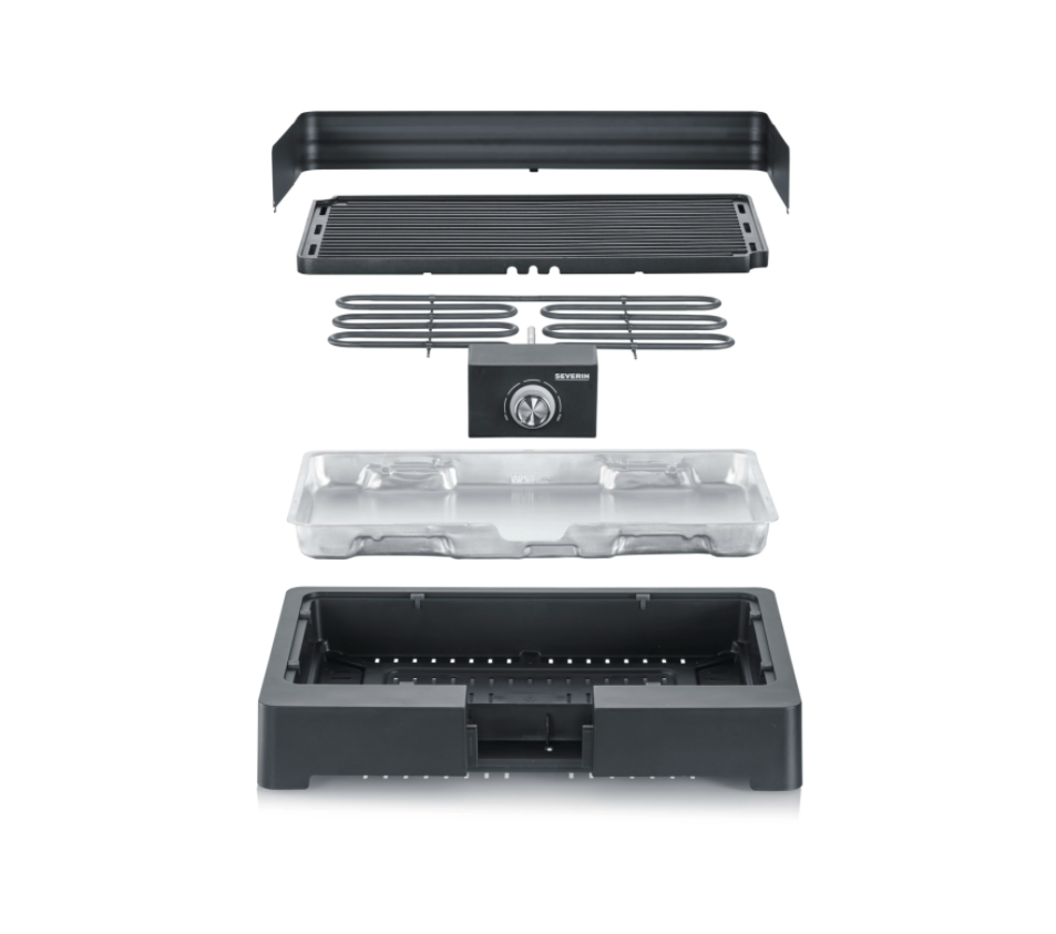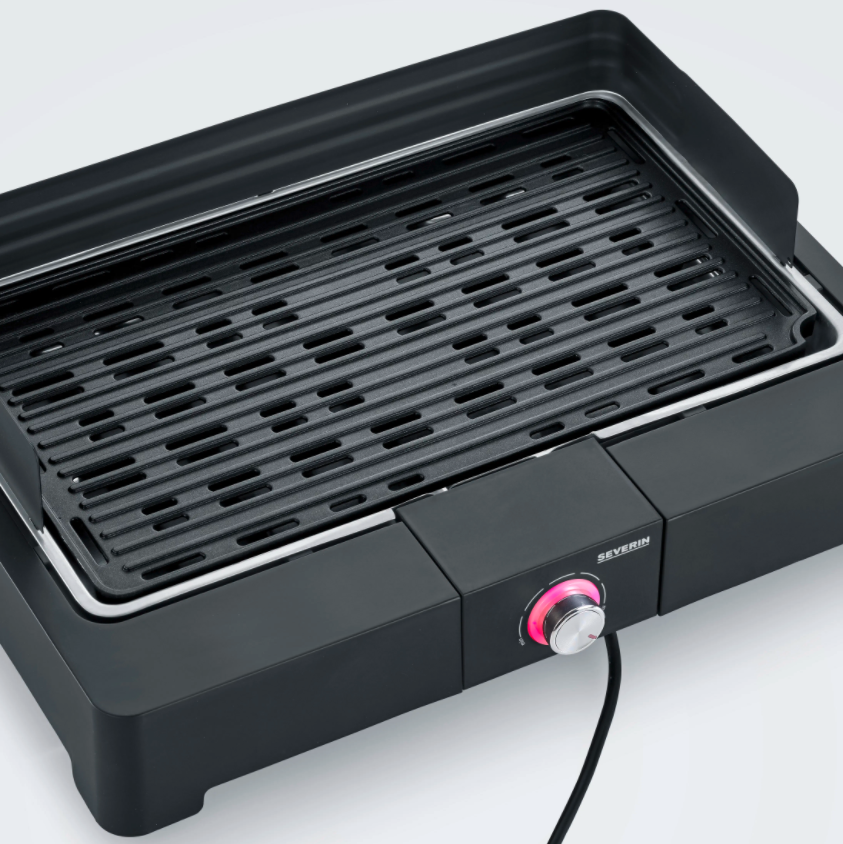 Severin PG 8567 table grill with grill plate · plug-and-grill: quick grilling pleasure thanks to short heating-up time – indoors & outdoors · no risk of burns on the surfaces, thanks to SafeTouch casing · ribbed grill plate for perfect grilling results · Easy cleaning thanks to the modular structure and many removable parts Specification weight: 3.532 kg dimensions: 39.5 × 52 × 15.5 cm cable length: 1400mm heating plate coating: non-stick coating adjustable thermostat: 1 grill surface type: grill plate fluted power: 2200watt