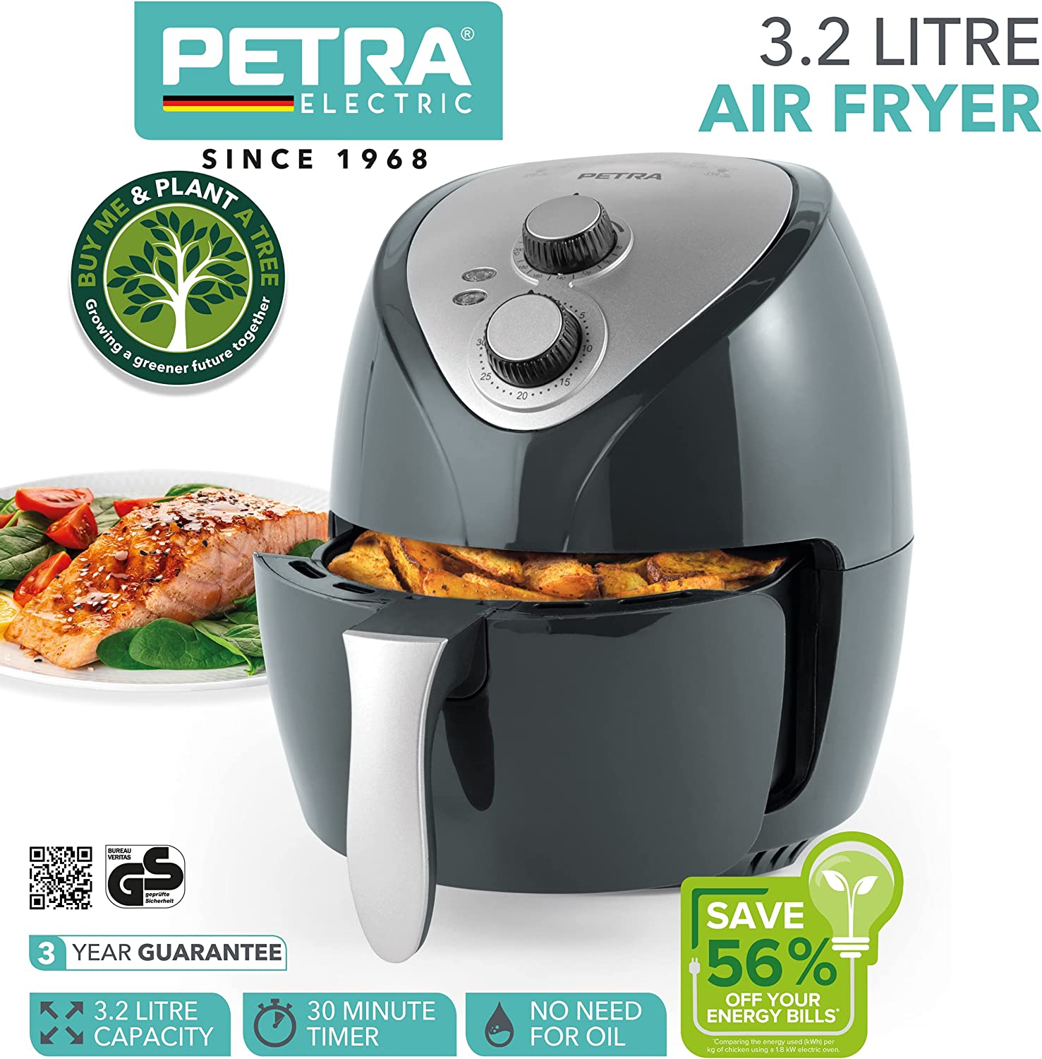 Features Save 56% on your electricity bills. With its 30-minute timer and adjustable temperature, this versatile 3.2L air fryer features a removable nonstick cooking basket. A healthy alternative to traditional frying, it uses hot air circulation and requires little or no oil, while maintaining the same taste. Technical data Capacity: 32 L Dimensions (L x W x H): 26.3 x 31.8 x 30.9 cm Weight: 3.2 kg Power: 1300 W Non-stick coating: Yes