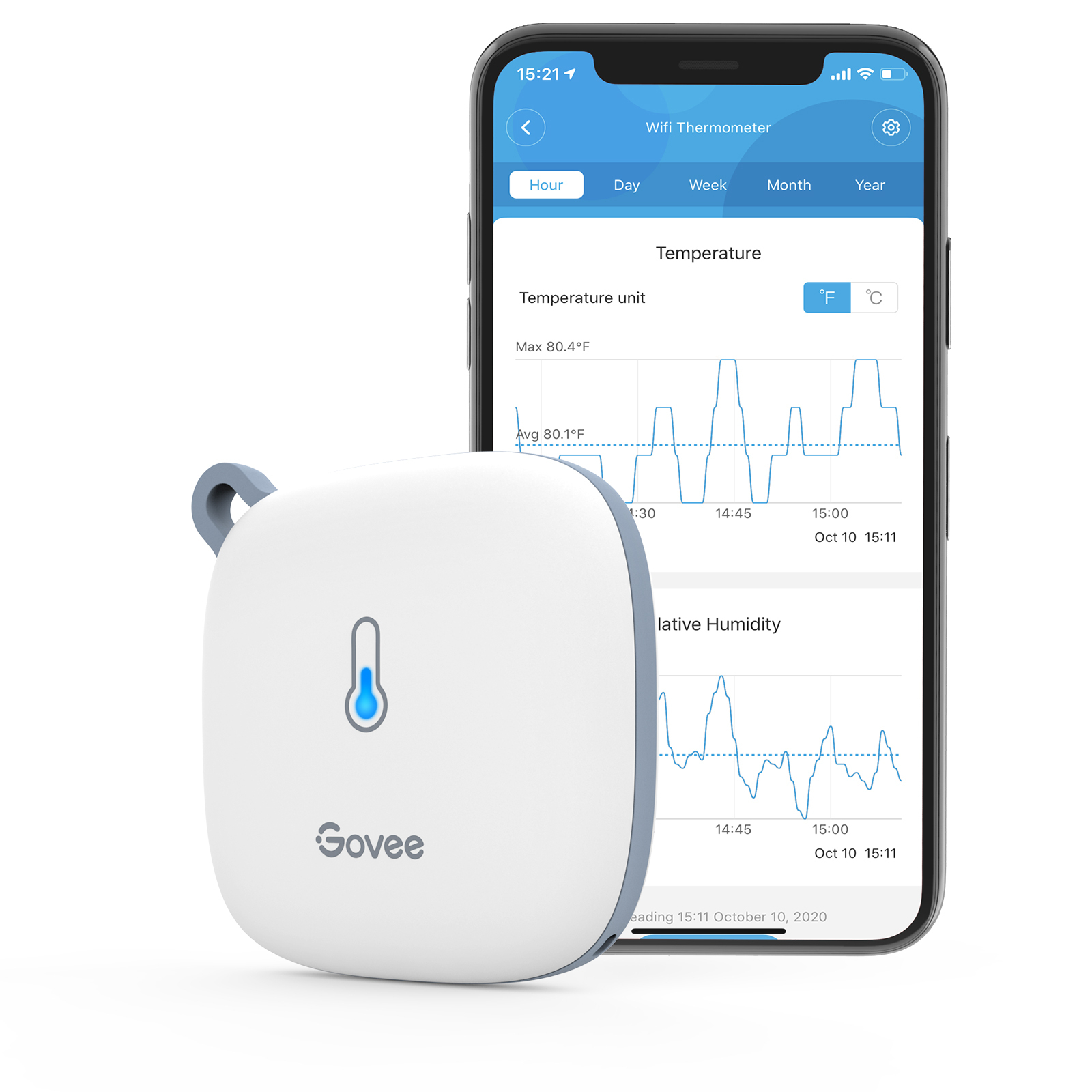 Govee WiFi Thermometer Hygrometer is a wireless device that accurately measures both temperature and humidity. It allows you to monitor indoor air conditions around a plant terrarium, wine cellar, incubator or bedroom, for example. The device connects via Bluetooth or WiFi to your smartphone, giving you real-time data and alerts directly to the Govee app.