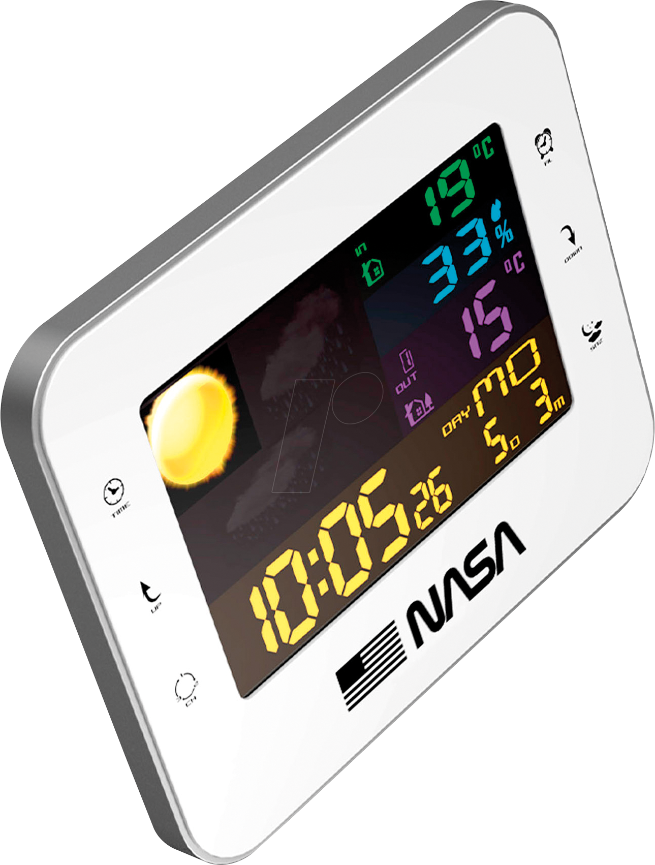 Nasa WS500 Weather Station ROCKET Outdoor sensor Weather icons In- and outdoor temperatures (°C / °F) Outdoor humidity rate Colorful 6" LCD screen Calendar / Clock / Alarm functions Comfort indicator Hours in 12 / 24 h format Power supply Indoor device: Power via USB cable (without AC adaptor) or 3x LR03 Sensor: 2x LR03 Technical Details Type: Radio weather station Colour: white Assembly: with clock Design: digital Accessory: Wireless outdoor sensor Display type: LCD Air pressure: no Humidity: yes power supply: Batteries Alarm Clock: yes Forecast: Weather symbols Date- and time display: yes Range: 10 m Width: 182 mm Height: 144 mm Depth: 17 mm Weight: 280 g