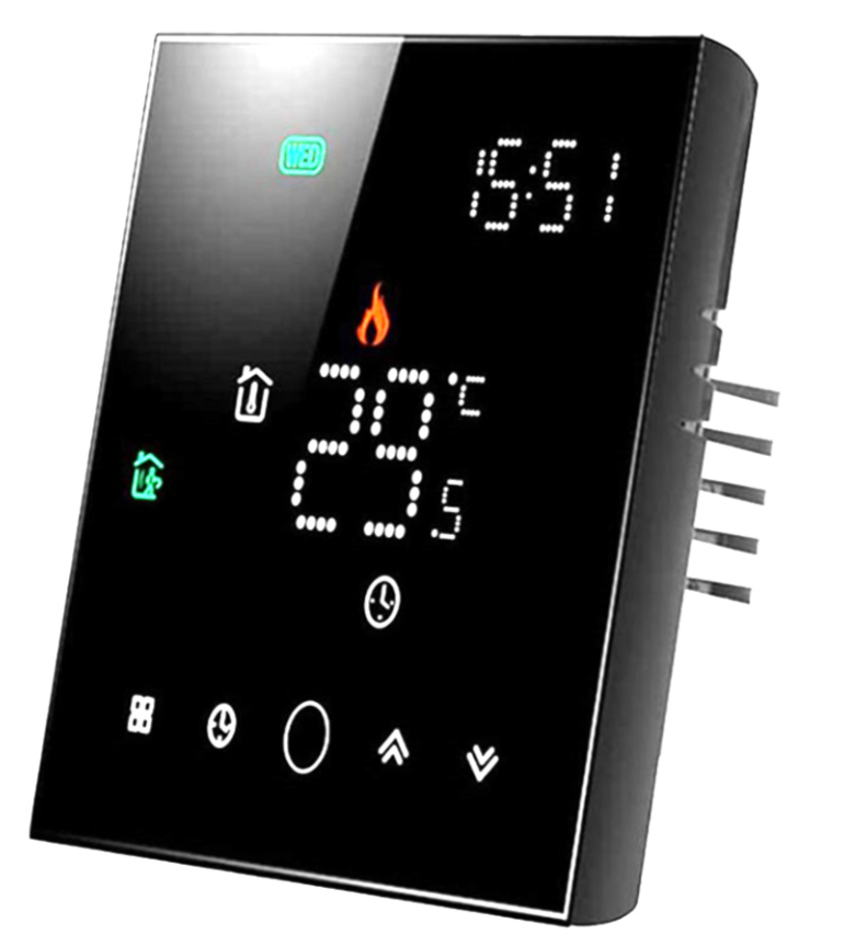 The Tuya HS082062 is a programmable WiFi thermostat designed for controlling electric or water underfloor heating systems. It features air and floor temperature sensors for precise parameter adjustment. The device can be controlled via a mobile app or voice commands through Amazon Alexa or Google Assistant. Specifications: Connection Type: Wired (mounts into a junction box) Power Supply: 220V Temperature Adjustment Range: 5–35 °C Measurement Accuracy: ±0.5 °C Sensor Type: NTC 10k Programming: 5+2, 6+1, or 7 days with 6 periods per day Control Methods: Mobile app (iOS/Android), voice control via Alexa/Google Assistant