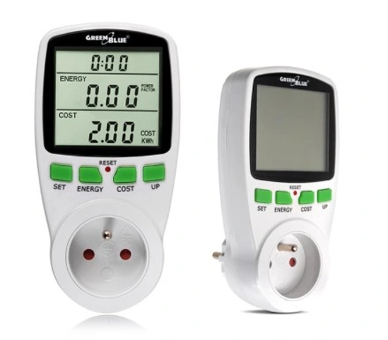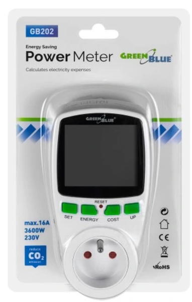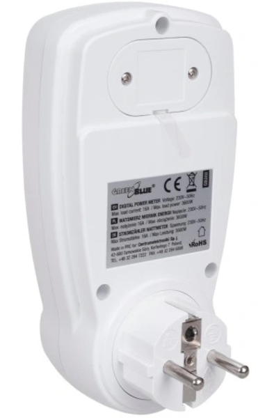 Features:display of measurement time displaying the network voltagedisplay of power consumptiondisplaying the current socket load (device power in watts)displays and records the total electricity consumptiondisplays and records total switch-on time and energy charges (after defining the rate) - - displays the frequency of the electrical network, power factor Specification:power supply 230VAC 50Hzmemory backup: 3 LR44 batteries (not included)maximum load 3600W, 16Avoltage measurement range: 200V – 276Vvoltage measurement error ± 1%current measurement range 0.01A - 16Acurrent measurement error ± 1% or 0.01Apower measurement range 0.0W - 9999Wpower measurement error ± 1% or ± 0.2Wtotal energy measurement: 999.9kWhfrequency measurement range 45Hz - 65Hzclock error ± 1min/monthpower consumption <0.5Wworking temperature -0°C to +50°Cmax 256 programs