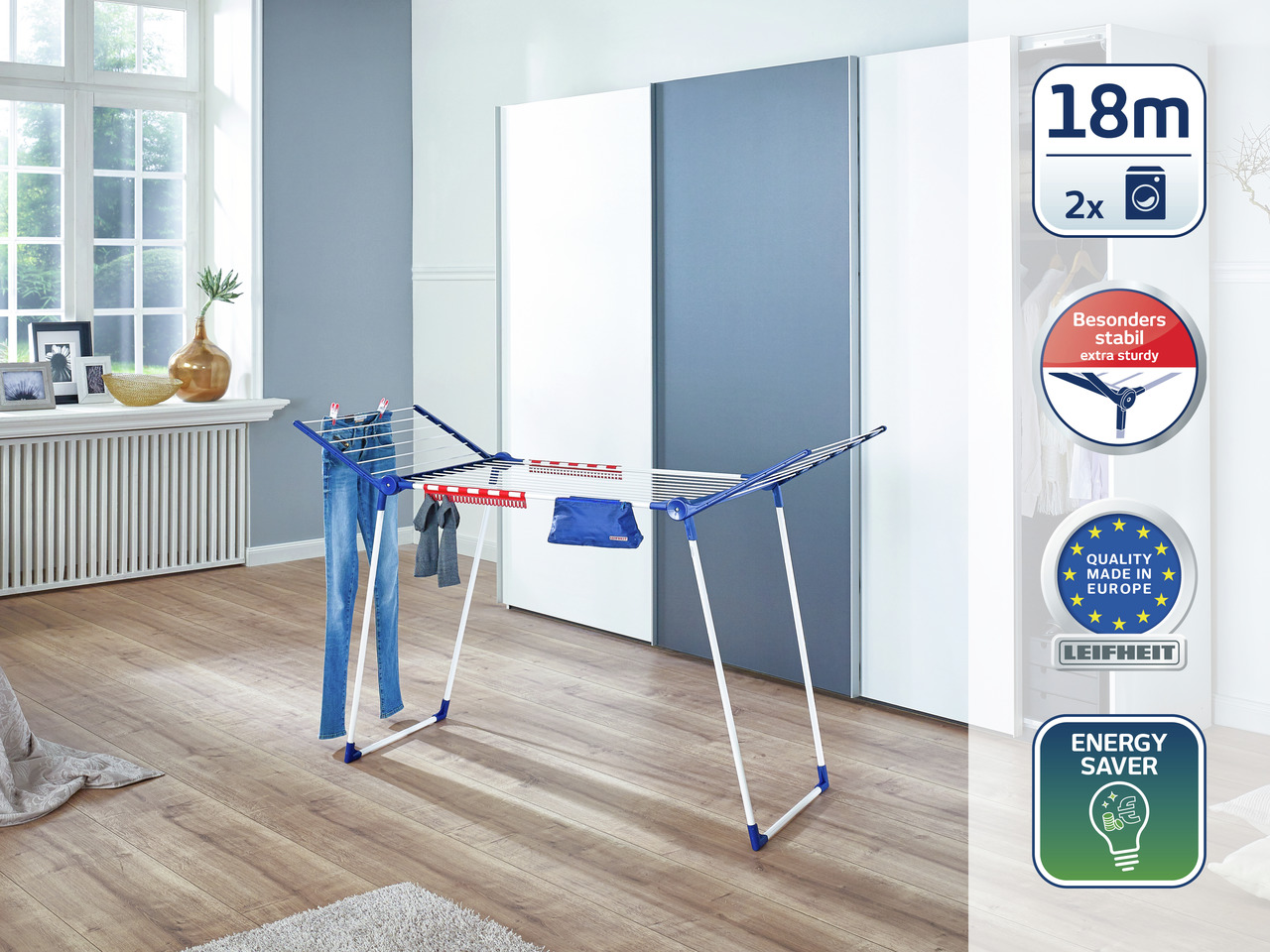 Mõõdud: kõrgus - 87-105 cm, pikkus kokkupanduna - 95 cm, pikkus lahti keeratuna - 157 cm, laius - 66 cm. Trosside kogupikkus - 18 m, Keskmiselt saab kuivatada umbes 12 kg tsentrifuugitud pesu, Valmistatud metallist ja kvaliteetsest plastikust, Email on pihustatud pulbertehnoloogia abil, mistõttu on see murenev, vastupidav ümbritseva atmosfääri mõjudele ega karda põrutusi, Lisaks on tarvik väikeste esemete nautimiseks, Tugev, praktiline ja funktsionaalne. Kerge lahti voltida, kompaktne, ei võta palju ruumi. Stabiilne, libisemiskindel, ei kriibi põrandat. ETTEVAATUST: Seda kuivatit ei tohi kasutada õues, kui temperatuur on miinus. Leifheit - 1959 asutas üle poole sajandi edukalt tegutsenud Saksa firma. Ettevõte on asutamisest saadik kiiresti kasvanud ja laienenud, pakkudes viimastel aastakümnetel ülitarku majapidamislahendusi. Innovatsioon on ettevõttes algusest peale mänginud võtmerolli. Ettevõtte moto: ""Alati parem idee"". Leifheiti oluline eesmärk on vähendada kodutöödele kuluvat aega ja teha majapidamistööd võimalikult lihtsaks.