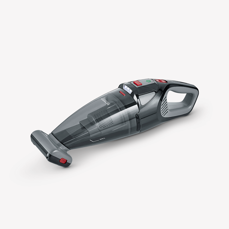 Practical combination with the extension tube and floor nozzle, the vacuum cleaner can also serve as a handy floor hoover Long runtime of up to 50 minutes (in Eco mode) owing to a high-capacity 18.5 V lithium-ion battery With rotating turbo brush and practical LED lighting ideal for cleaning upholstery and removing pet hair Practical crevice nozzle included perfect for cleaning cars and hard-to-reach areas Stylish carrying bag for storing all accessories with practical zip fastener and loop for hanging up Technical data Li-Ion battery: 18,5 V / 2.200 mAh Charging time: 5 hours Power max.: 120 W Dust container capacity: 650 ml Suction power: 5,5 kPa Rotations/min: 2.500 Running time: approx. 20 Min (Power-Mode) approx. 50 Min (Eco-Mode) Colour: Black-Grey/Red Features: Charging indicator with LED Filtration with filter classification H7 Auto cut off: Yes Dimensions: 122 x 24 x 13 cm Weight: 1.45 kg