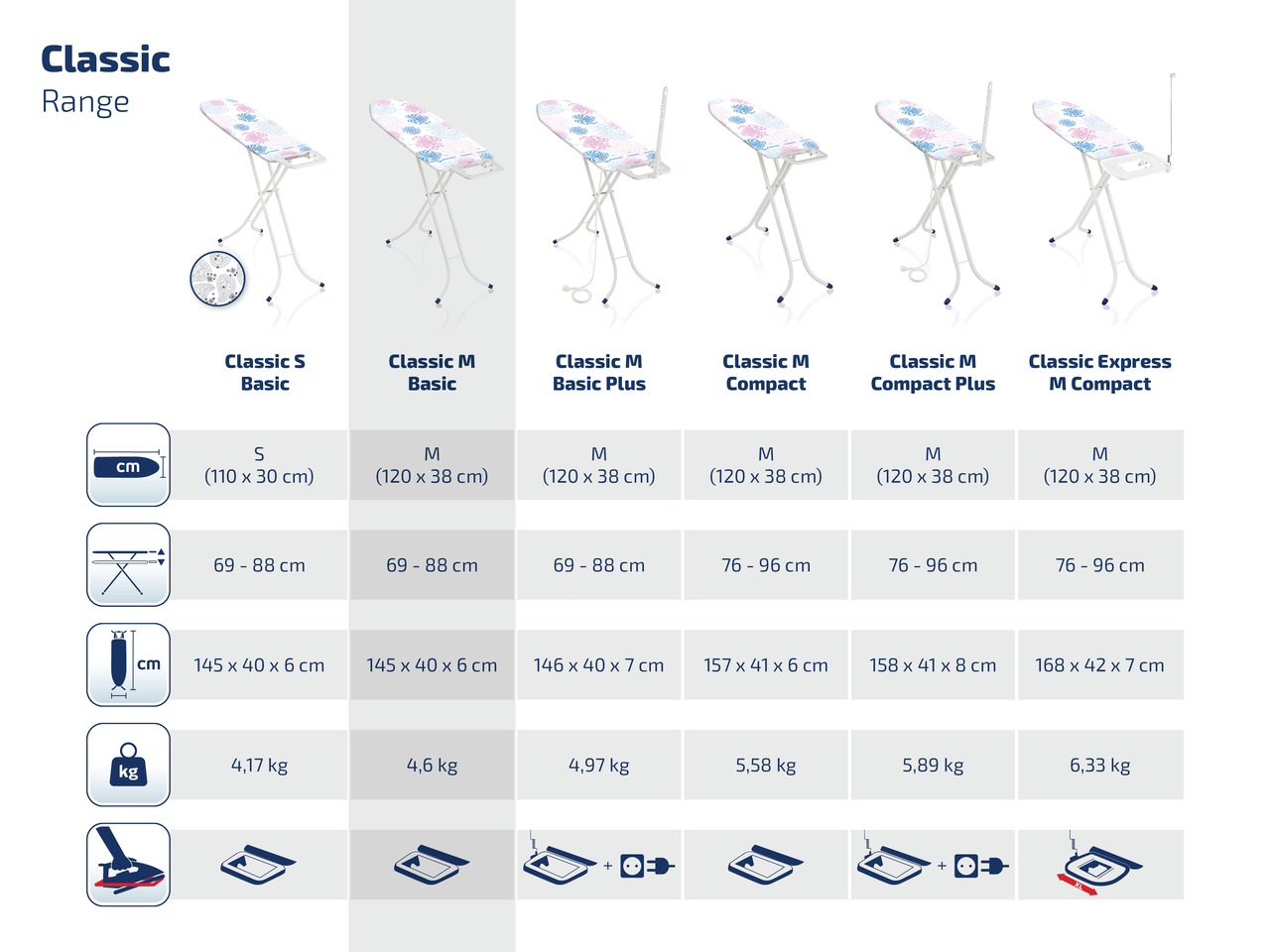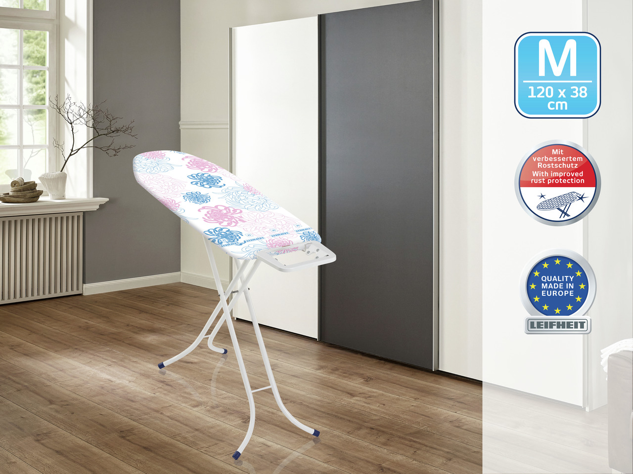 Triikimislaud Fashion M, klassikaline venitatud metallist triikimislaua raamiga, mille mõõdud on 120x38 cm. Kompaktne metalse raamistikuga triikimislaud, reguleeritava kõrgusega kuni 88cm. Auru läbilaskev puuvillase katte tehnoloogia tagab kvaliteetse triikimise kergema vaevaga. Laua katte paksus on 2mm. Varustatud eriti tugeva lapselukuga, mis võimaldab ka mugavat laua liigutamist ning ei ole ohtu, et laud ootamatult lahti läheks. Leifheiti triikimislaudu iseloomustab suurepärane vastupidavus, kõrge kvaliteet, mugavus, kergus, pikk garantiiaeg ja unikaalsus.
