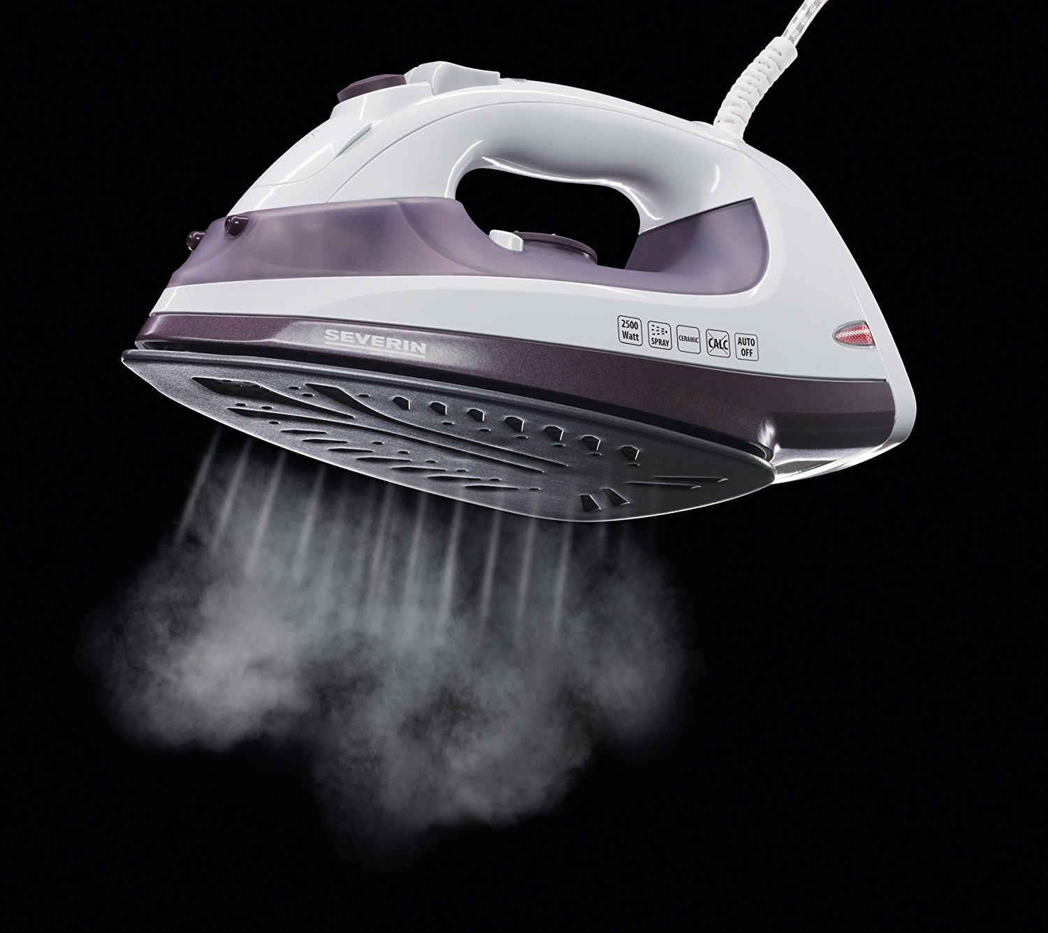 - for steam and dry ironing- variable setting of steam quantity up to 30 g/min. (permanent)- with vertical shot of steam up to 70 g/min.- automatic shut off- double-spray function- anti scale feature- anti drip function- self cleaning system- non-stick ceramic coated soleplate- rubber coated handle for safe handling- variable thermostat- temperature pilot light- ready-to-use indicator, water level indicator- thermal safety cut-out- reversible power cord- cable storage- measuring cup Features Type: Dry & Steam iron Soleplate type: Ceramic soleplate Variable steam: Y Steam boost performance: 70 g/min Auto power off: Y Steam boost function: Y Colour of product: Purple,White Continuous steam performance: 30 g/min Automatic anti-calc: Y Vertical steam function: Y Water tank capacity: 0.225 L Anti-drip function: Y Spray function: Y Anti-scale system: Y Soft grip: Y Ergonomics Cord storage: Y Indication Water level indicator: Y Temperature-ready indicator: Y Power Power: 2500 W Other features Dimensions (WxDxH): 305 x 125 x 160 mm