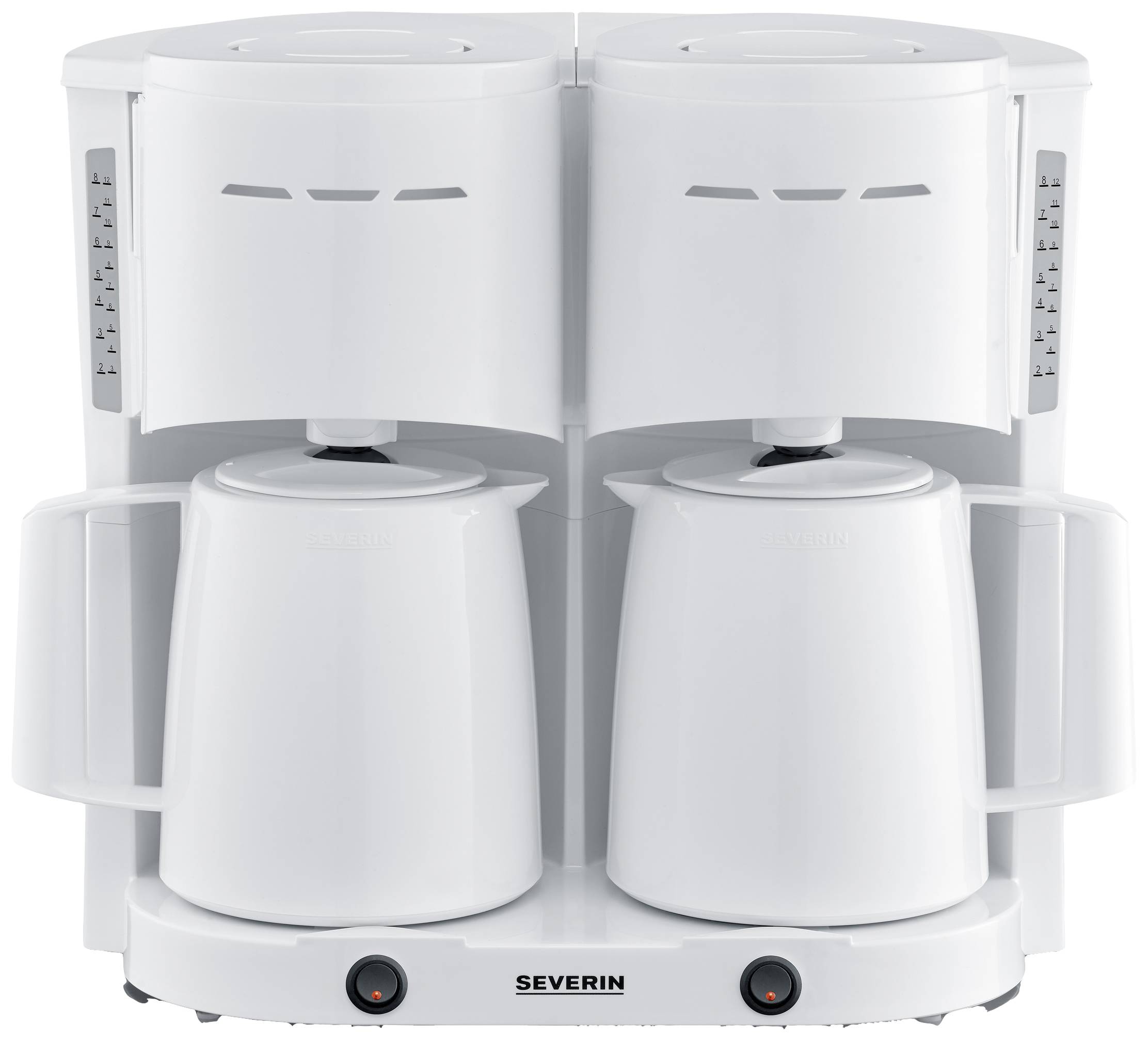 Double coffee enjoyment at the same time Simultaneous preparation of two pots of coffee with 8 cups each - perfect for offices, guesthouses or restaurants Two thermal jugs with a practical brew-through lid ensure long-lasting, hot coffee enjoyment Two water level indicators on the front enable convenient operation and the best overview Integrated cable compartment for easy storage of the cable Technical data Power: 2 x 1,000 watts Capacity: 2 x to 8 cups Color/Material: White Special features: 2 thermal jugs with brew-through lids for long-lasting temperature storage 2 swivel filters 1 x 4 with drip cap 2 on/off buttons with indicator lights Cable length: 70 cm Auto power off: Yes Dimensions: 39.5 x 25.5 x 36.6 cm Weight: 4.4 kg