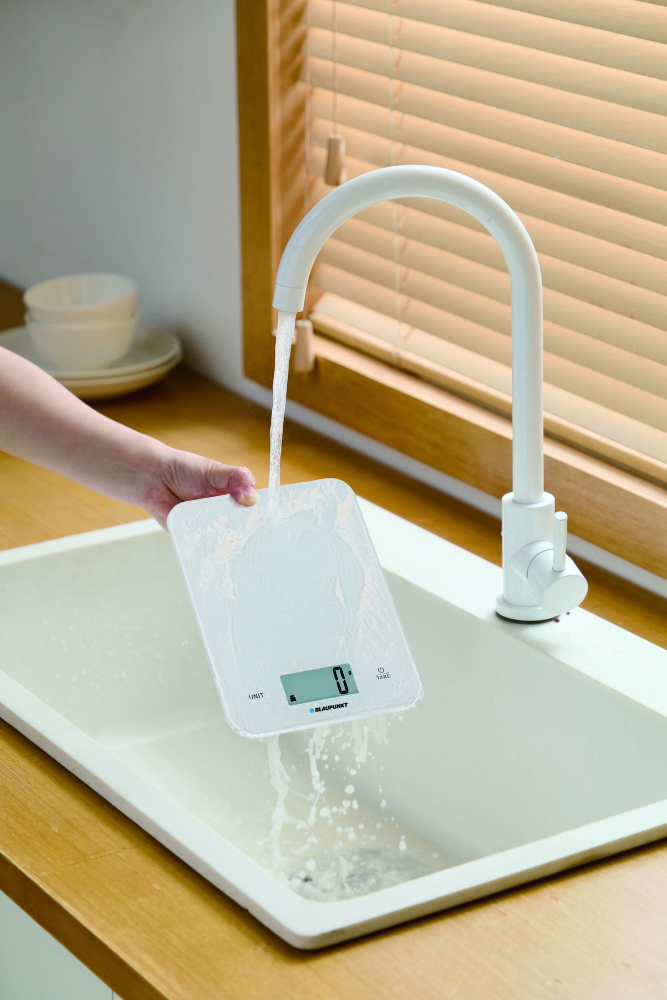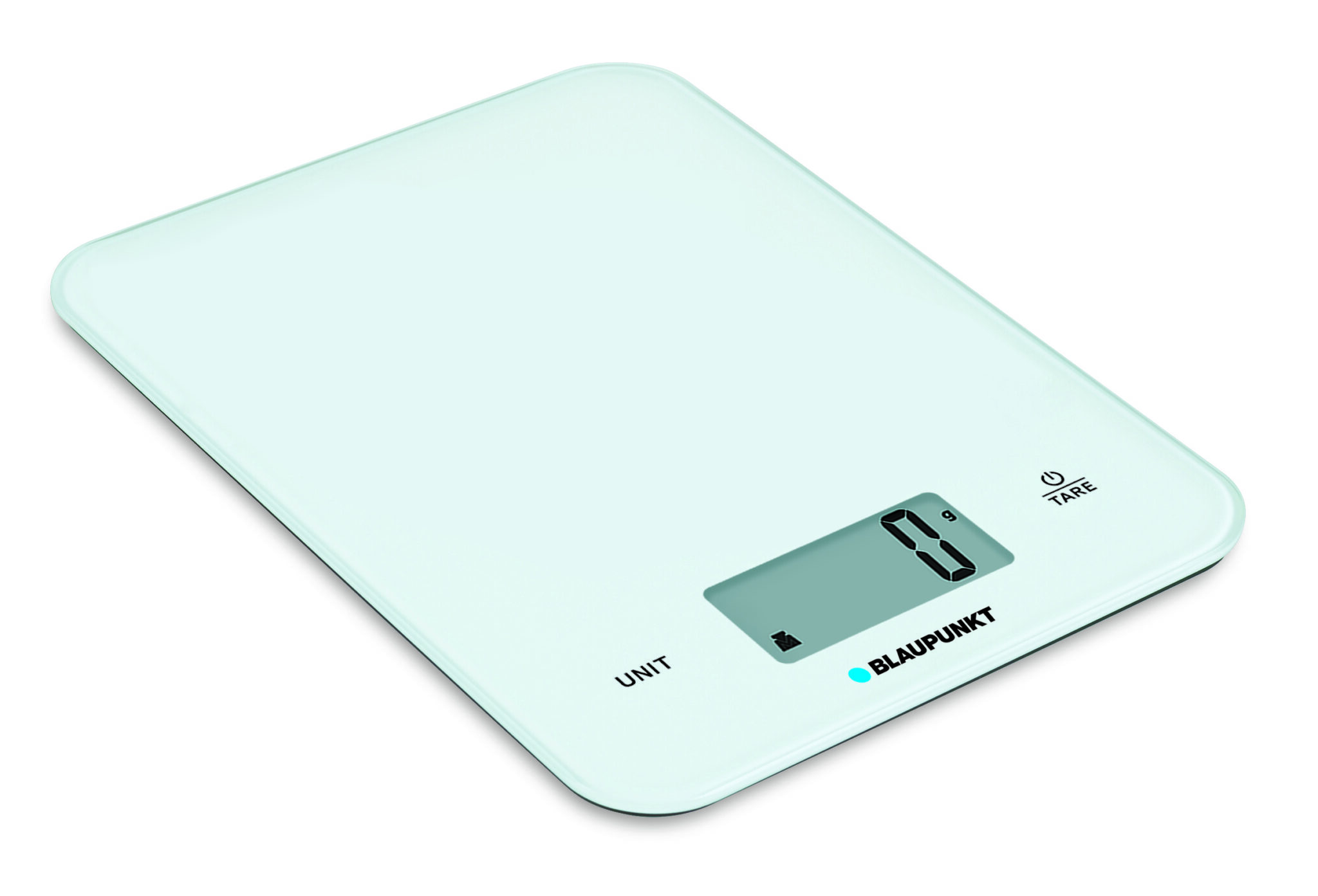 Capacity: max 10 kg, division 1 g Tempered glass (3 mm) weighing platform Washable under running water Touch button Indicate volume of water and milk Power supply: 3 x AAA batteries (included) Dimensions: 21 x 16 x 1.9 cm Weight: 0.41 kg
