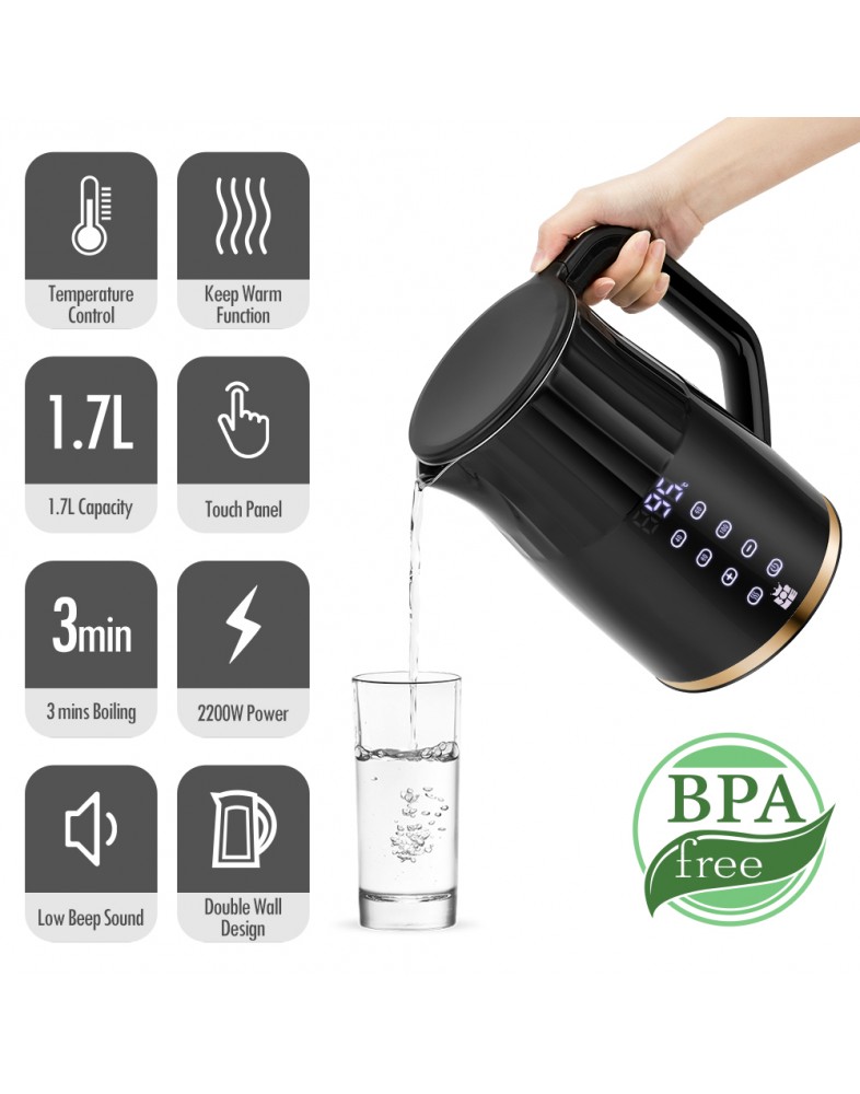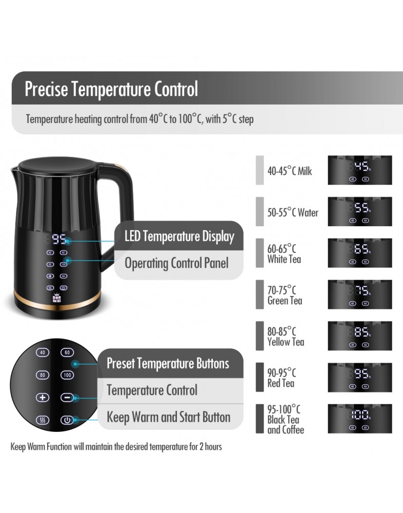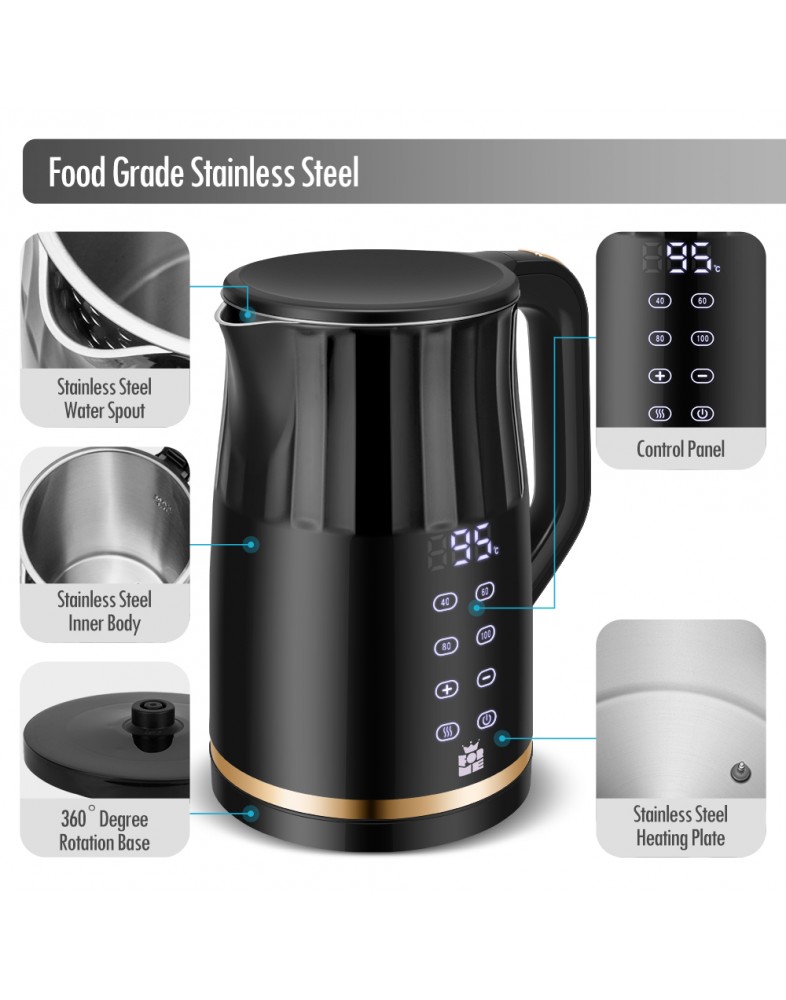 Features Large digital temperature screen display Four buttons for four pre-set temperatures Temperature selection in the range of 40-100°C in 5°C steps Automatic Keep Warm function after boiling Automatic Standby Mode for saving power Shows actual water temperature Concealed SUS304 stainless steel heating element Dual wall construction, glass interior layer with plastic exterior layer Technical data Rated Power: 220-240V, 2200 W Body: Stainless Steel Color: Black Capacity: 1.7 L Power Cord Length: Visible 70-75cm Temperature adjustment: Yes Heating element: Stainless Steel, Hidden Temperature range: 40-45-50-55-60-65-70-75-80-85-90-95-100 Water level indicator: No Keep warm function: Yes Automatic shut off: Yes Sound signal: Yes Overheat protection: Yes Antiscale filter: No Cord storage: Yes Dimesions: 20 x 20 x 16 cm