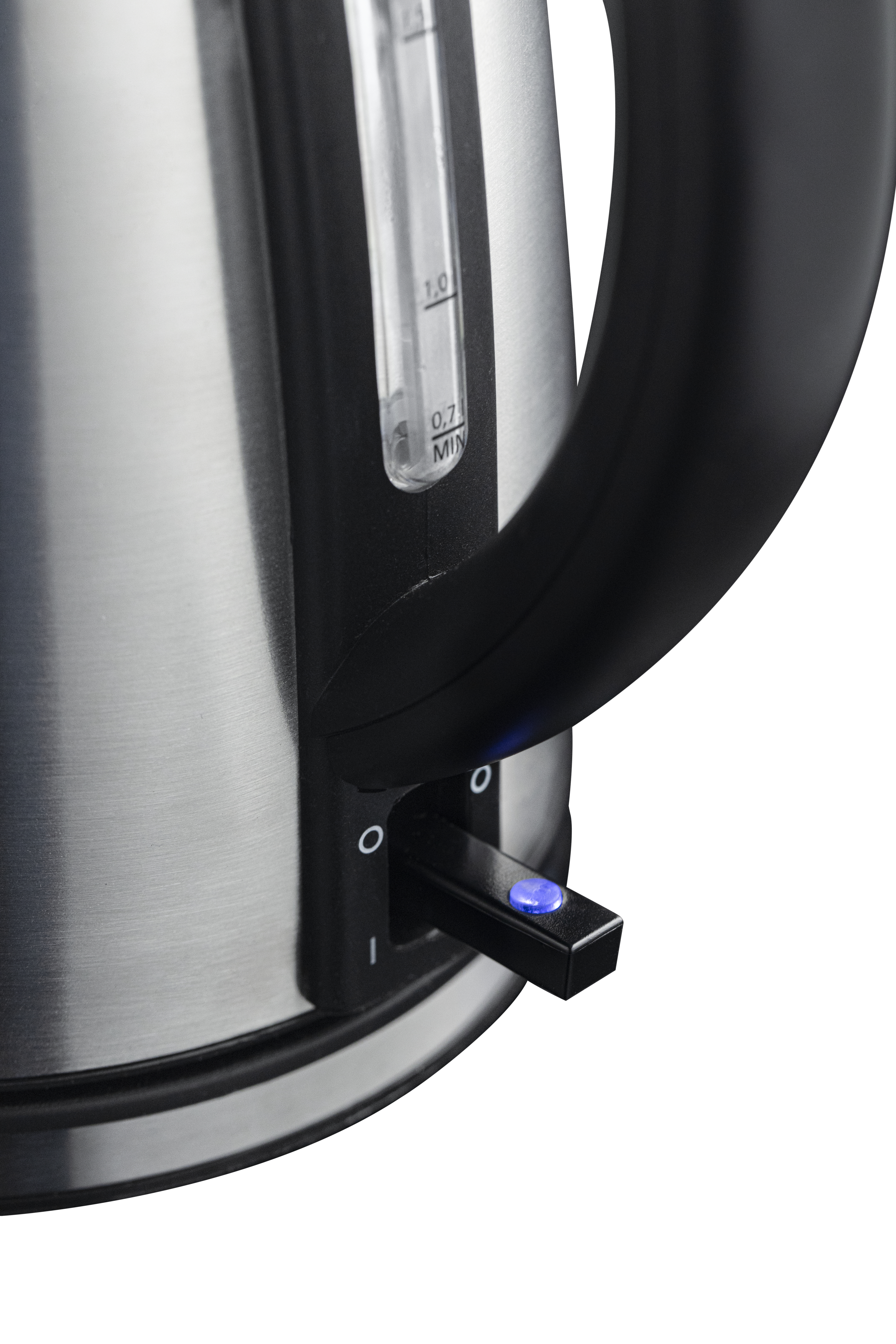 Power: 1850 – 2200 W Capacity: 1.7 l Housing material: Stainless steel Illuminated switch: Yes Safety systems: Automatic shut-off when water boils, Automatic shut-off when removed from the base, Switch-on protection without water Lid opening support: Yes Sediment filter: Yes Color: Silver Additional functions: Rotating base, Flat/hidden heater, Single-sided water level indicator, Cable storage