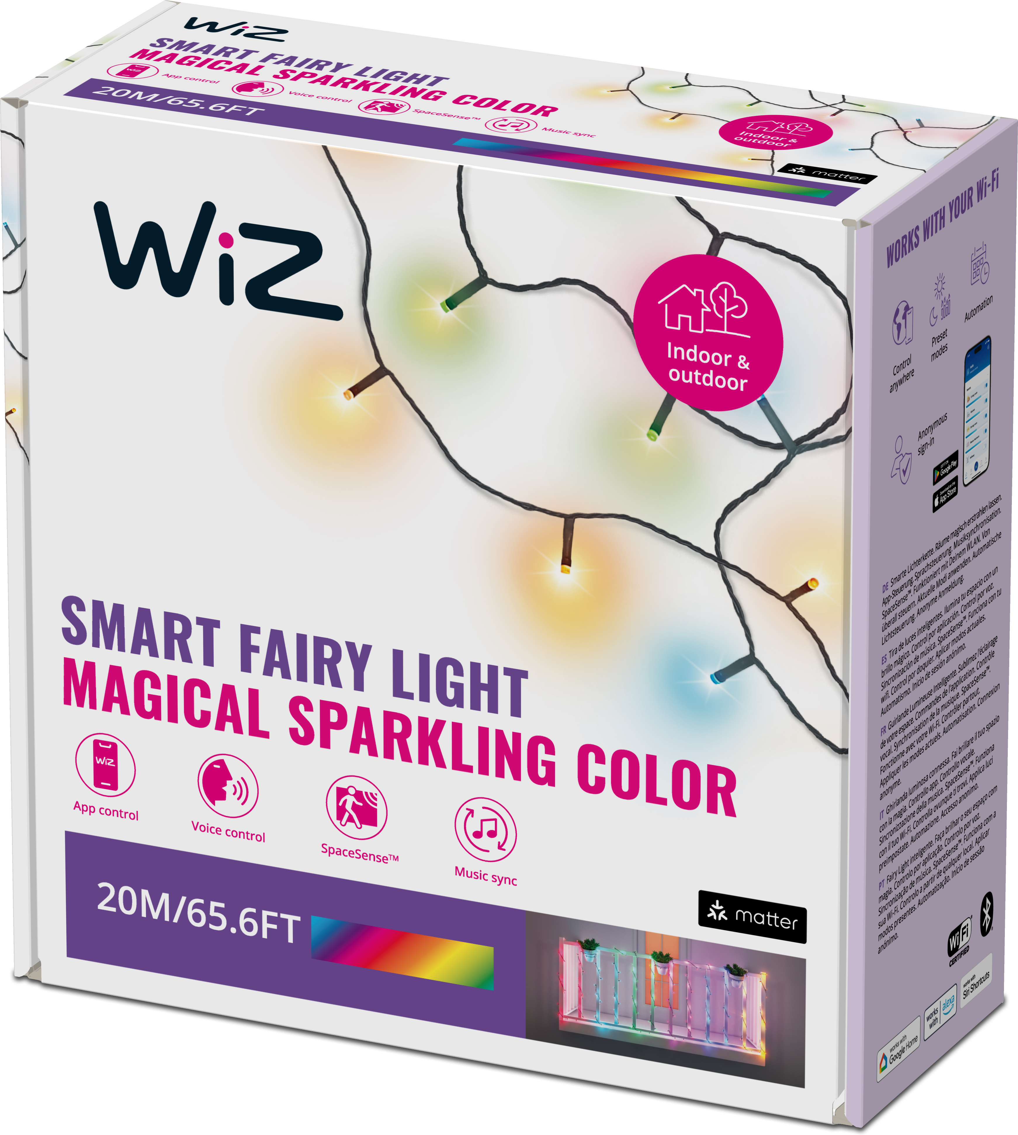 Whether it's a big party, a night out with friends, a family celebration or an ordinary evening at home, you can create a magical atmosphere with the colourful WiZ Fairy light decorative light set. The decorative light set features 160 intelligent LED lights, different lighting settings, 8 different light zones and millions of colour shades. So you can easily lift the mood and adapt it to suit any occasion. You can wrap the lights around a Christmas tree, place them on a windowsill, use them as decorations for birthday parties or light up your balcony or terrace on those lovely long summer nights. WiZ lighting is easy to control from anywhere with the WiZ app. You can even sync the lights to music to create a party atmosphere.