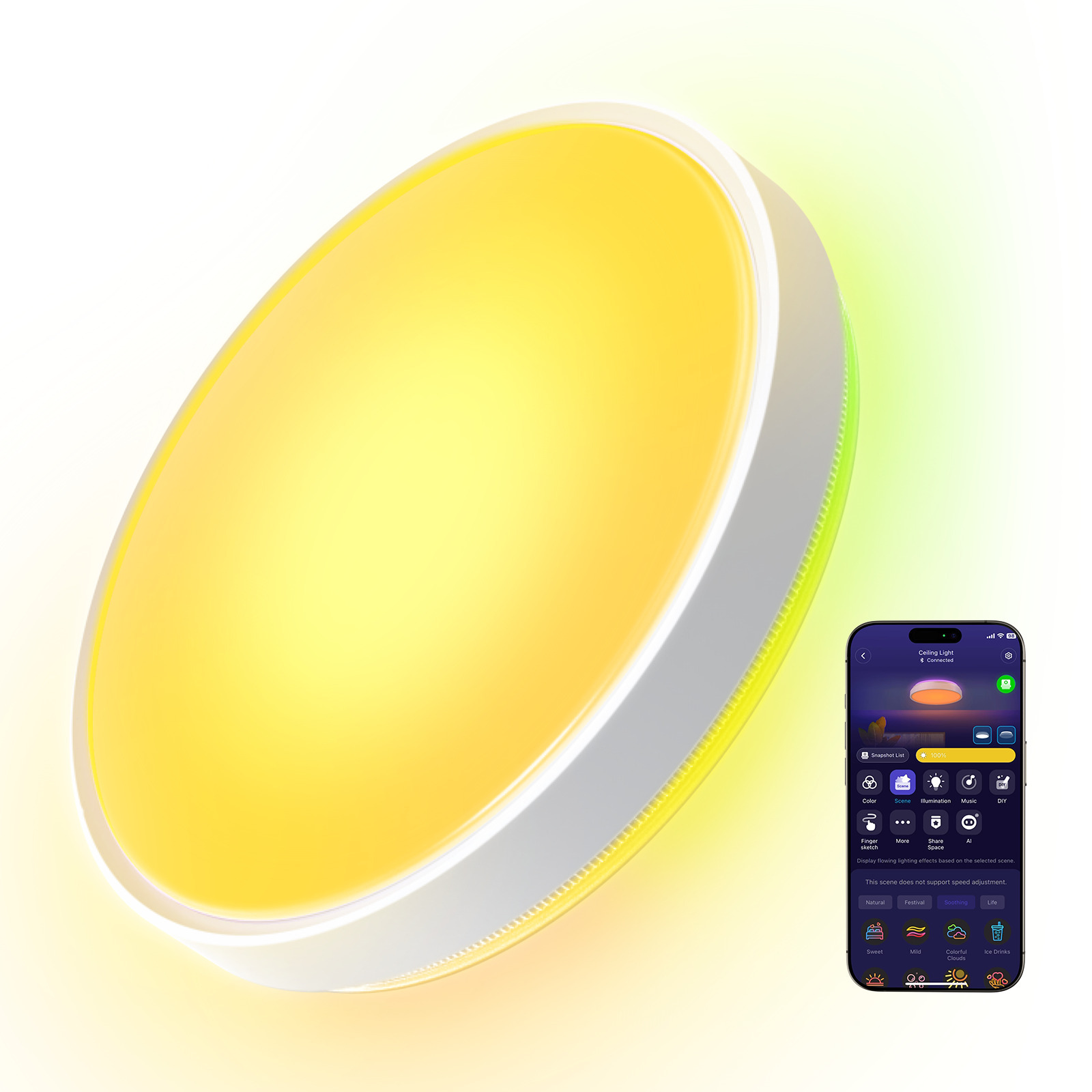 Govee Round Smart Ceiling Light is an efficient and intelligent ceiling light with RGBIC+WW technology that allows you to create colourful and dynamic lighting effects. The 4300 lumens of brightness makes the luminaire brighter than conventional ceiling luminaires.
