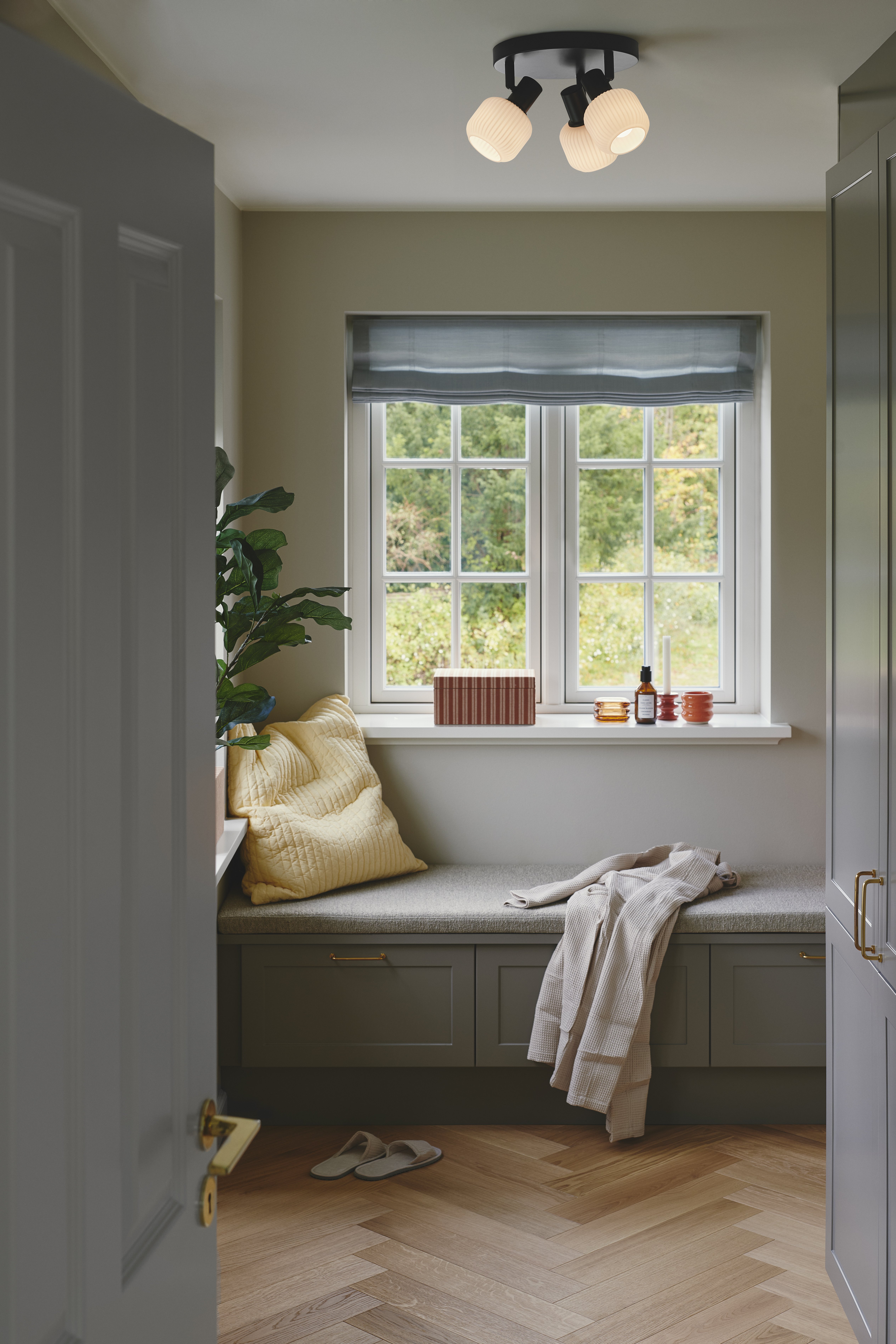 Nordlux Milford Mini is a decorative 3-piece ceiling light with mouth-blown opal white glass shades that contrast beautifully with the black metal body. The organic shapes and ribbed surface of the glass domes create an elegant look and soft lighting throughout the space. The simple and modern design is suitable for a wide range of interiors such as hallways, lounges or bedrooms. Fixed installation, with sugar ball socket.