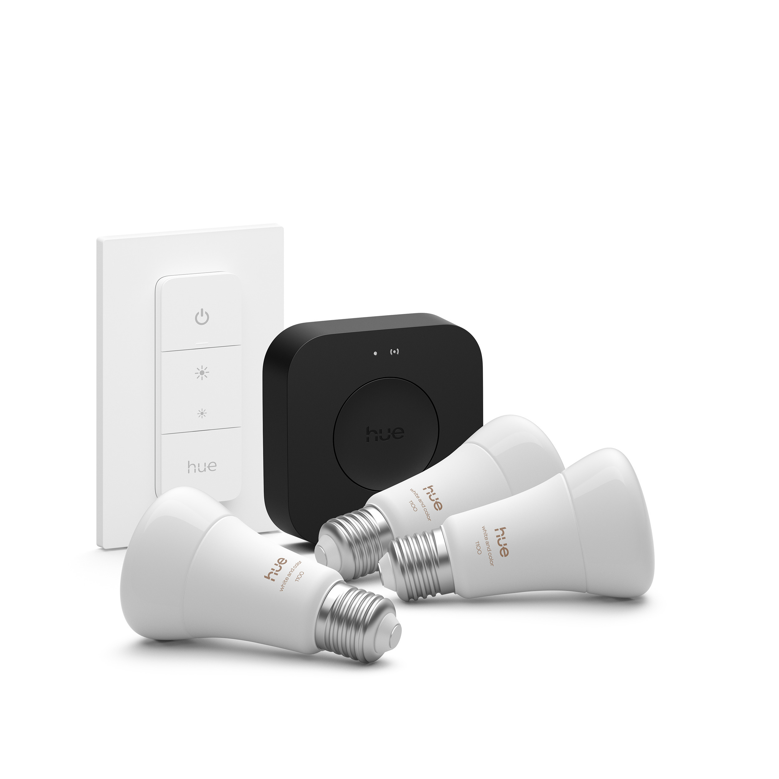 Selles Philips Hue White and color ambiance ‑komplektis on kolm A60 nutikonda, millel on E27-pistik, ning Bridge Pro ja Dimmer switch.