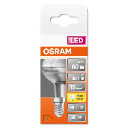 - Outdoor applications only in suitable luminairesOsram STAR. Bulb power: 4.3 W, Equivalent bulb power: 60 W, Fitting/cap type: E14, Luminous flux: 350 lm, Bulb lifetime: 15000 h, Light colour: Warm white, Colour temperature: 2700 K, Beam angle (max): 36°, Color Rendering Index (CRI): 80, Power factor: 0.4