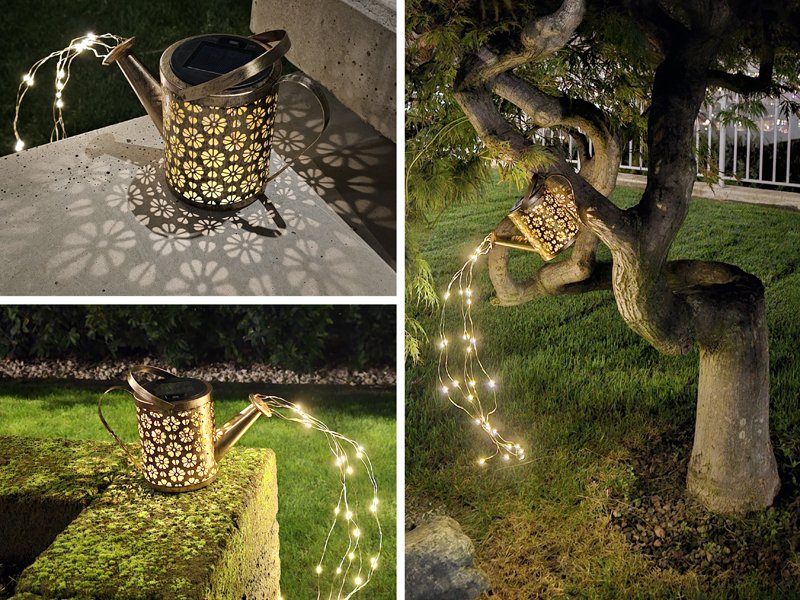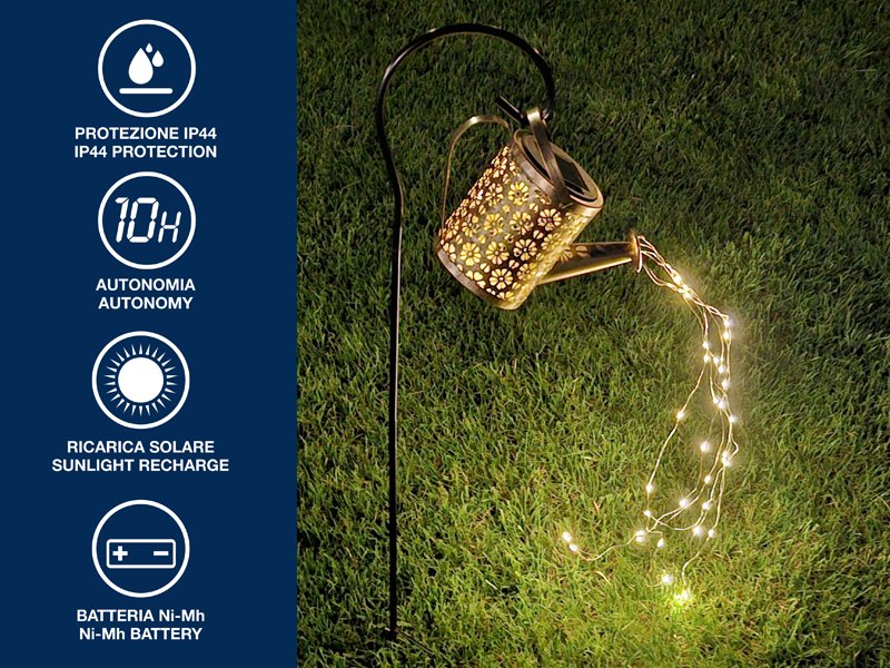 Solar Watering Lamp Ideal for decorating and illuminating gardens and terraces Metal lamp with rust-proof gold coating Light cascade with 36 flashing LED mini-lights 80 cm pole with double peg for fixing in the ground Automatically switches on in the dark and off in the light Solar rechargeable with up to 10 hours runtime Ideal for outdoor use thanks to IP44 water protection