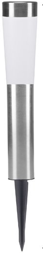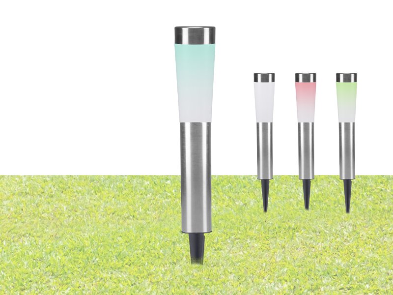 Practical orientation light for garden and balcony including ground spike. The lamp turns on automatically in the dark and turns off in daylight, thanks to the energy that comes from sunlight. The spike allows the lamp to be fixed to the ground anywhere in the garden, next to flowerbeds or along paths. 3 selectable modes: white light, OFF, colored light. Plastic and stainess steel body, glass solar panel. Charging time: 4-6 hours. Autonomy: 6-8 hours. Ni-Mh battery 100mA. Diameter: 7.5 cm. Total height with spike: 56 cm. IP44" protection. Size: 7.50 x 7.50 x 56