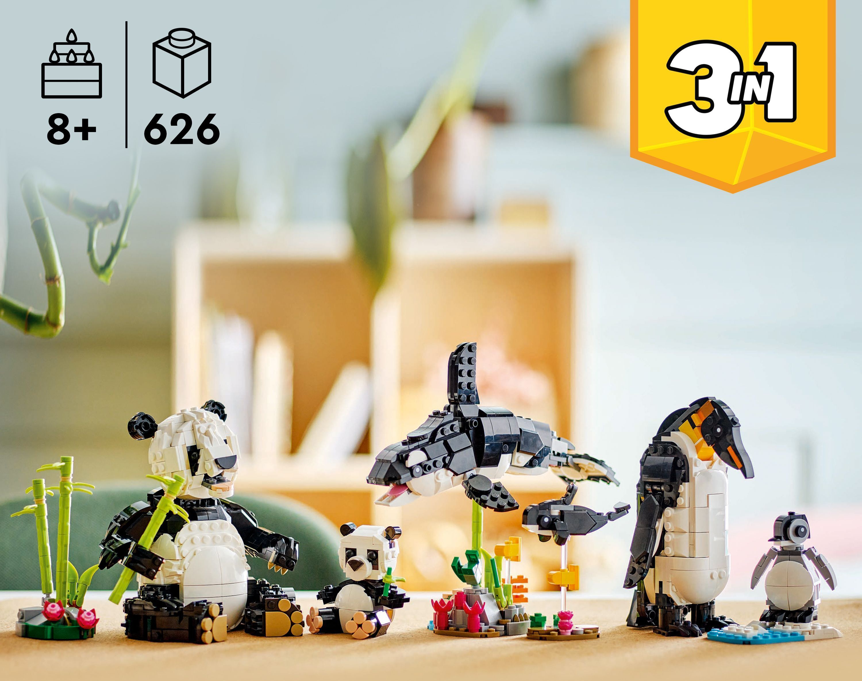 From the pieces of this LEGO® set, kids can build 3 different miniatures: a bendable panda with its cub and bamboo arm, a bendable killer whale with its cub and transparent stand, or a bendable penguin with its cub and ice floe. The LEGO set of 3 building blocks is perfect for children as gifts, decorations and imaginative play.