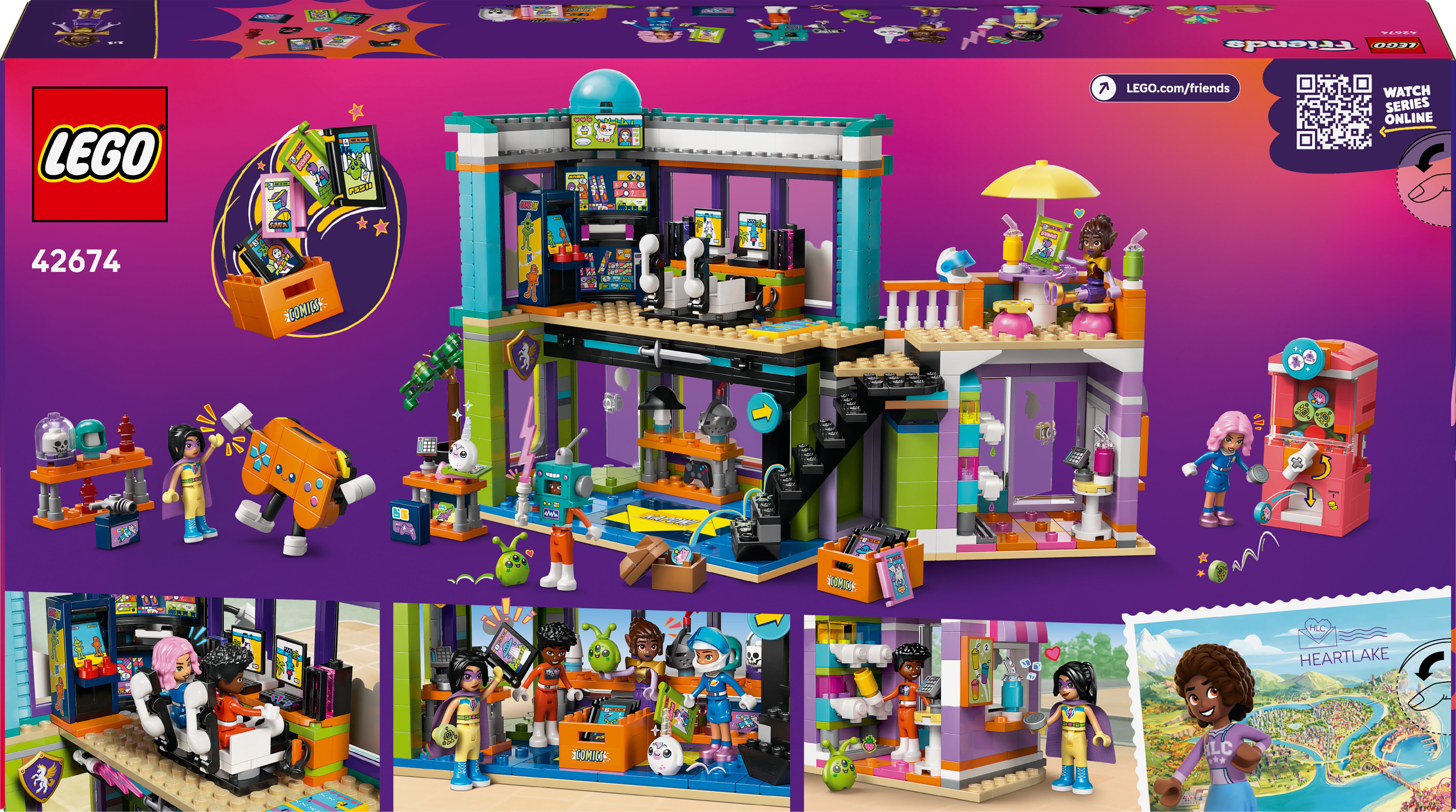 Tämä yksityiskohtainen rakennussarja raottaa supersankareiden ja tarinankerronnan maailmaa luovista leluista nauttiville lapsille. LEGO® Friends Sarjakuva- ja pelikauppa (42674) 9 vuotta täyttäneille tytöille ja pojille sisältää 4 LEGO Friends mininukkea sekä LEGO osista rakentuvat avaruusolento- ja yksisarvispehmolelut. Setti on täynnä hauskoja yksityiskohtia, jotka ilahduttavat nuoria rakentajia, sekä paljon tarvikkeita, jotka imaisevat koko perheen mukaan roolileikkeihin.