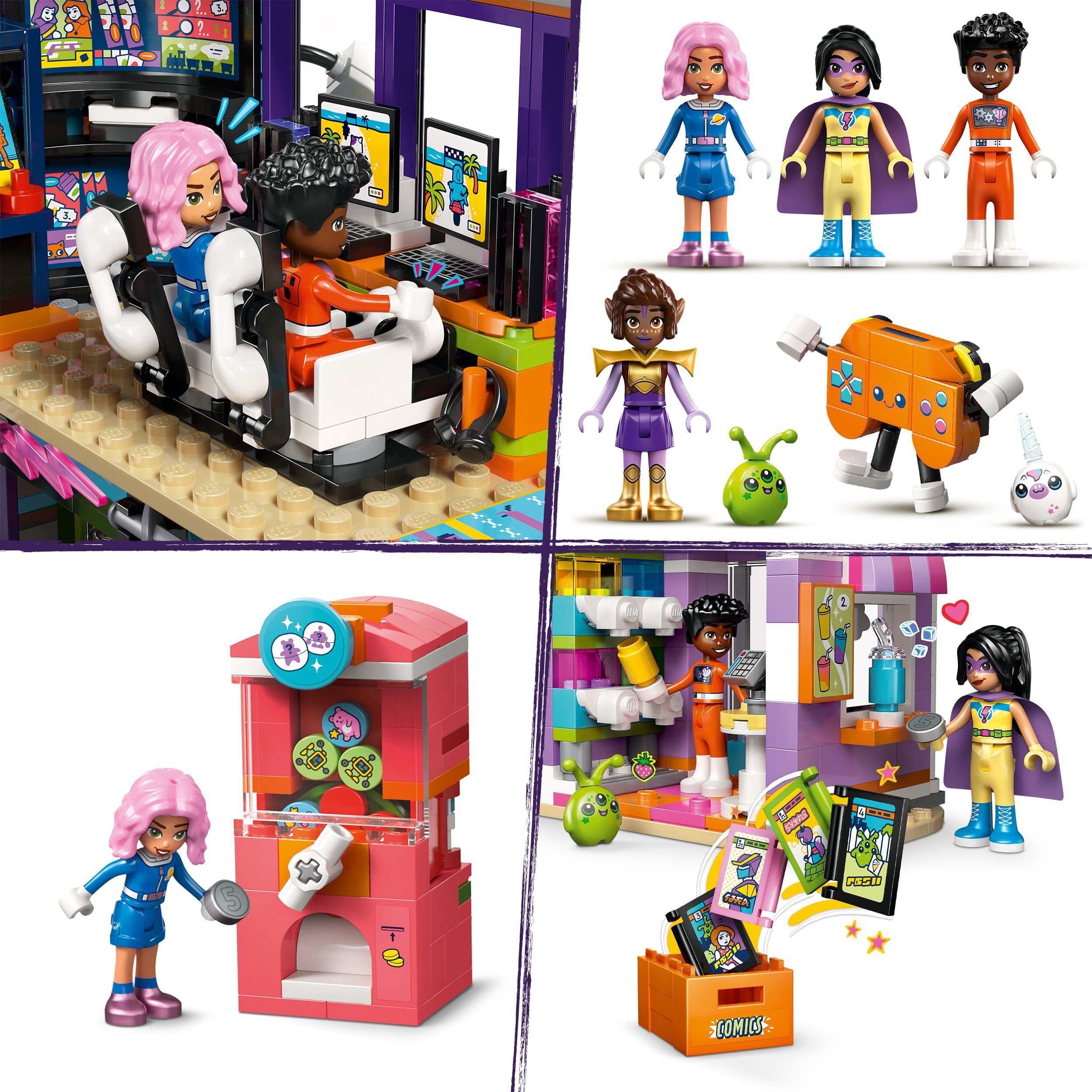 Sarjakuva- ja pelikauppa -lelu sisältää 4 mininukkea sekä LEGO® osista rakentuvat avaruusolento- ja yksisarvispehmolelut roolileikkeihin.