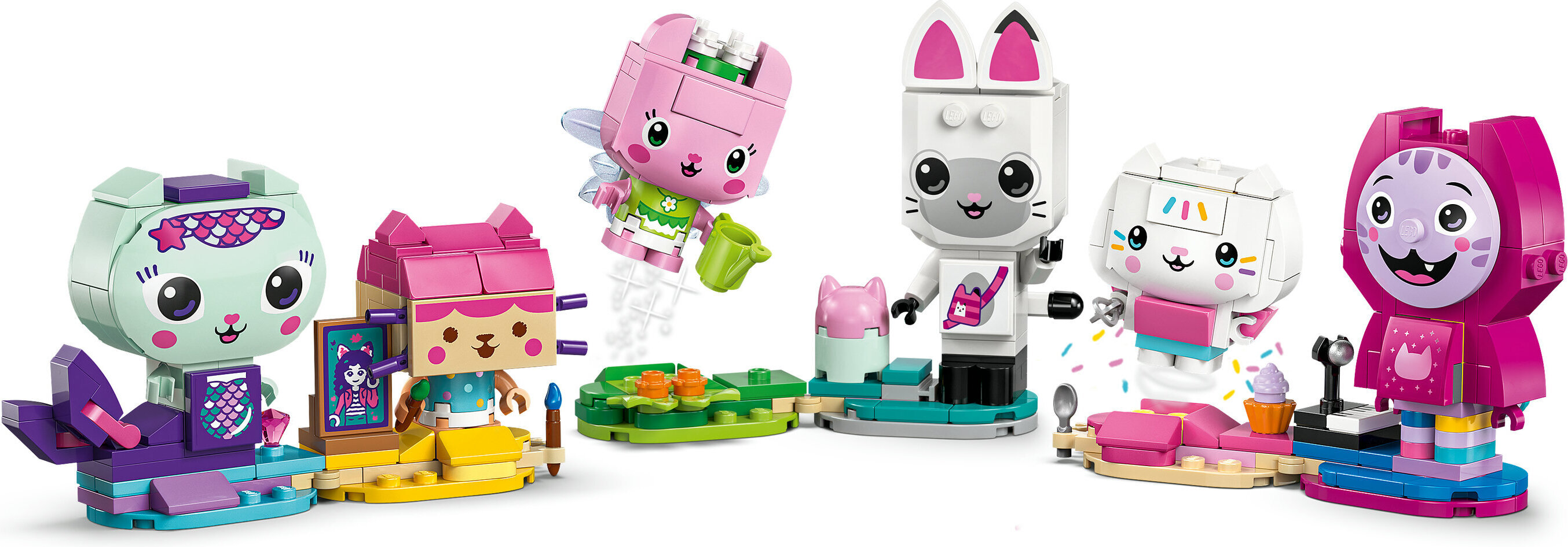 Setti sisältää 6 rakennettavaa hahmoa, joista jokaisella on TV-sarjasta tutut tarvikkeet: Merikatilla on timantti, Boksivauvalla on Gabbyä esittävä maalaus, Kisukeijulla on kastelukannu, Pandi Pörröllä on nukketalo, Hileellä on kakku ja Daniel Jalmari ”DJ” Nauskiksella on piano. Jokaisessa jalustassa on 2 irrotettavaa hahmoa. Suloinen setti on loistava lahjaidea Gabbyn nukketalo ‑sarjasta pitäville tytöille ja pojille.