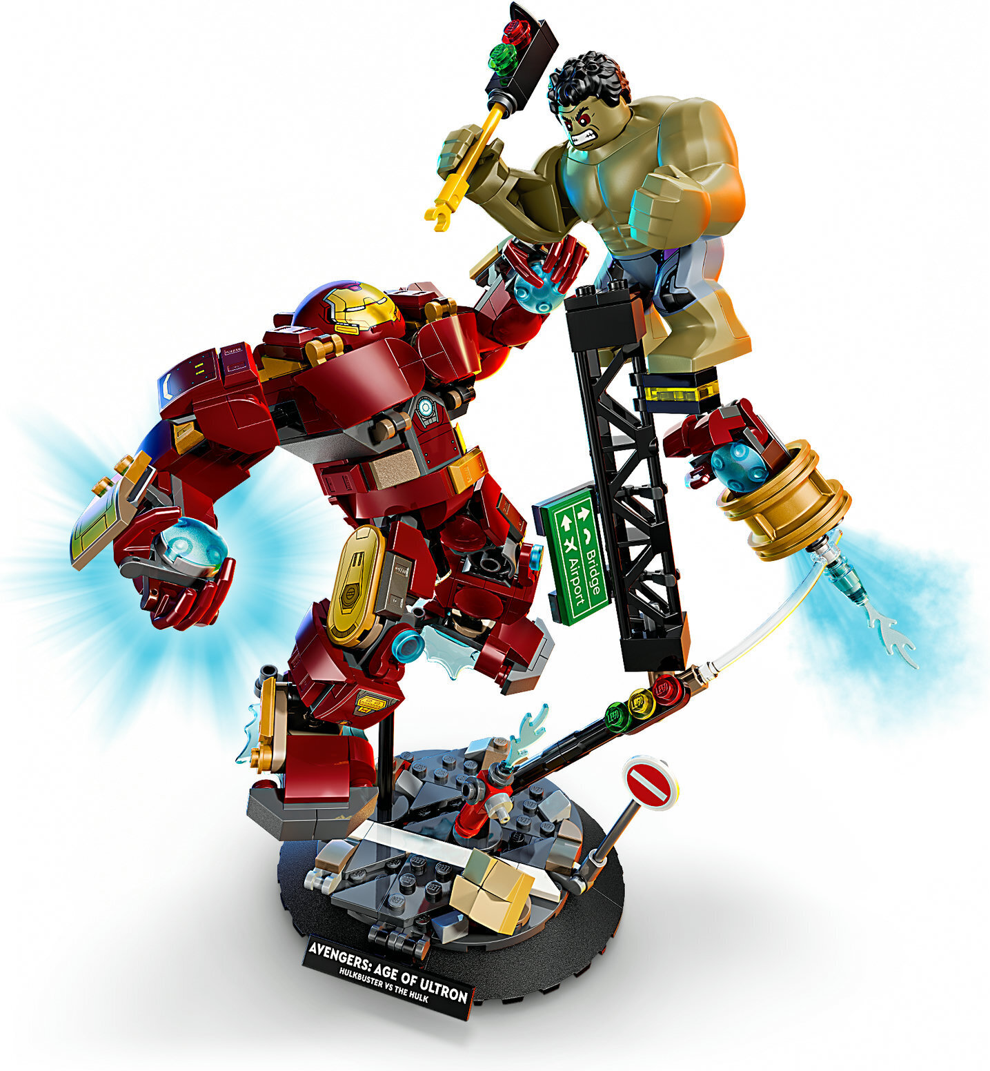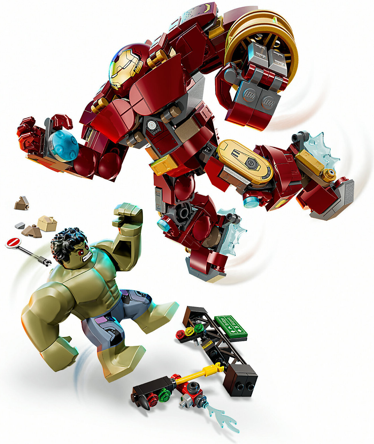 Iron Man taistelee Hulkia vastaan Hulkbuster-haarniskan avulla runnellussa katumaisemassa, jossa on romahtavia teräsrakenteita sekä liikennevalotolppa, jota Hulk voi käyttää aseena. Nivellettyä Hulkbusteria voi taivutella eri asentoihin. Tukevan jalustan ja nimikyltin ansiosta lapset voivat laittaa rakennelmansa koristeeksi, ja irrotettavat minihahmot innostavat keksimään ikiomia supersankariseikkailuja.