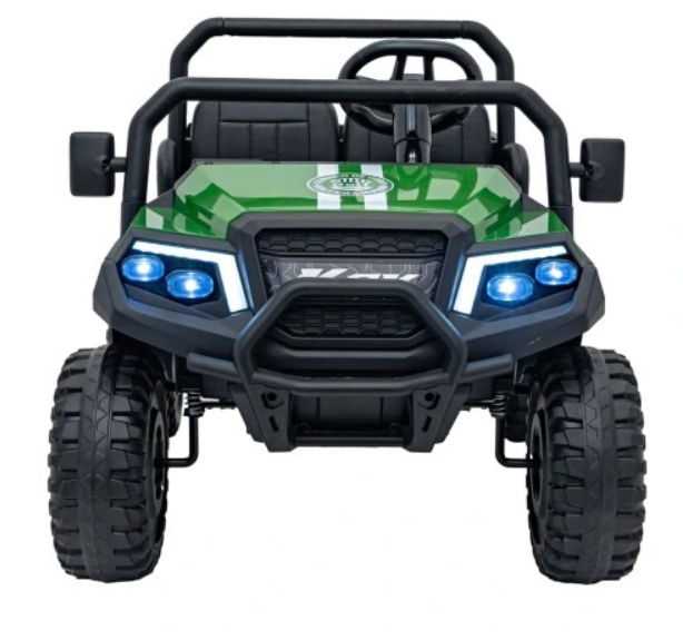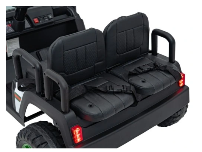This electric vehicle is designed for four children and offers a realistic driving experience with many safety and entertainment features. Technical Specifications: Motor: 2 × 200 W Battery: 24V 9Ah Remote Control: 2.4 GHz, 3 speeds, emergency stop button Wheels: EVA foam, size 29 × 12 cm Shock Absorbers: Front and rear Gears: Slow start, forward/reverse drive, 2 speeds Lighting: Front and rear LED lights with switch Audio System: FM radio, MP3, Bluetooth, USB port, sound buttons and horn on the steering wheel, built-in melodies Battery Charge Indicator: Yes Seats: 4 seats with safety belts, covered with eco-leather, each seat size 25 × 21 × 20 cm Vehicle Dimensions: 118 × 75 × 72 cm Vehicle Weight: 25.2 kg Package Dimensions: 118 × 65.5 × 37 cm Package Weight: 29.2 kg Maximum Load: 120 kg Ground Clearance: 19 cm Set Includes: Instruction manual, assembly kit, charger, MiniJack cable