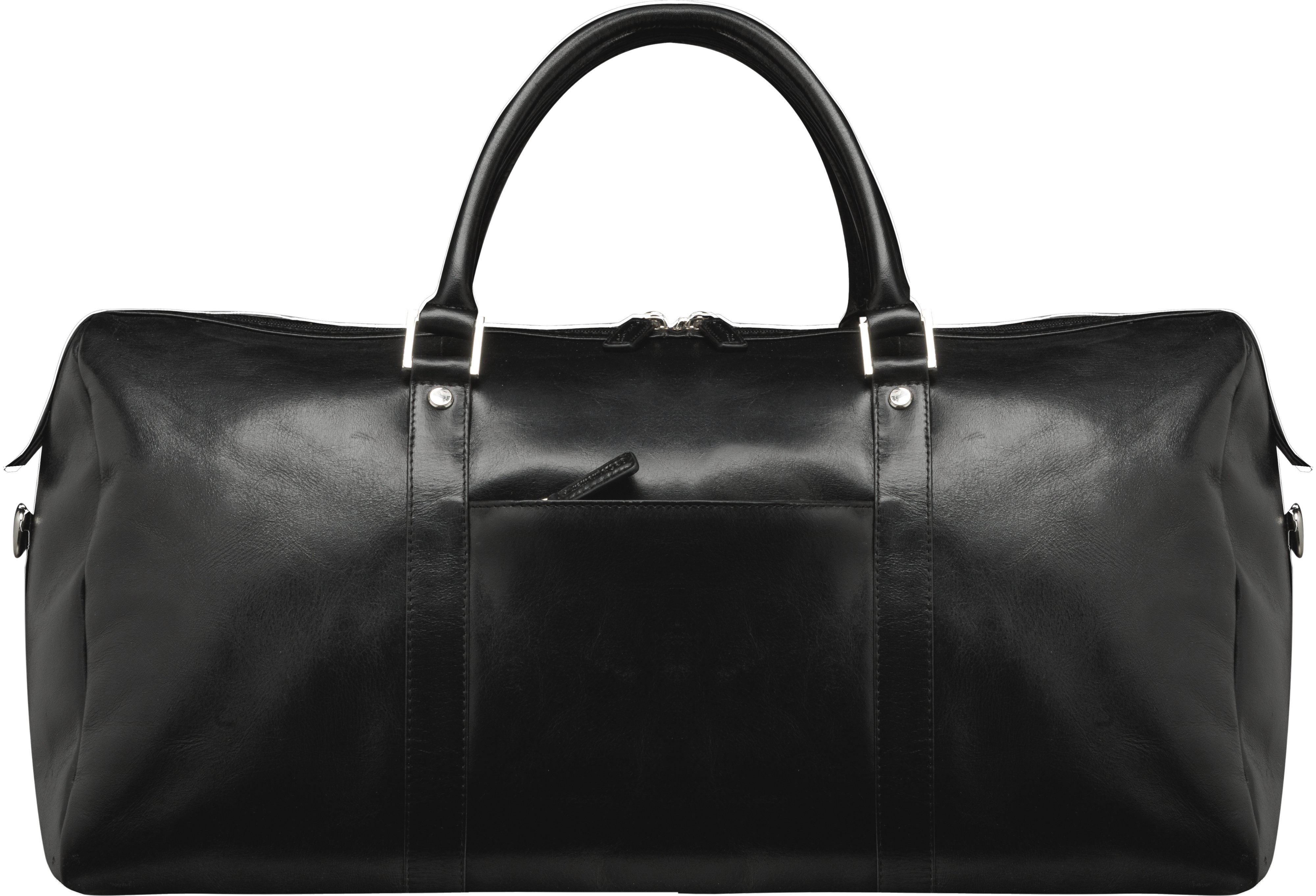 This luxurious, handcrafted full-grain leather weekend bag has just the right amount of space for weekend trips. The spacious main compartment is fully lined and features two roomy open pockets. The bag closes with durable two-way metal zips. On the outside of the bag is a single zippered accessory pocket. The bag can be carried by the padded carrying handles or the detachable shoulder strap.