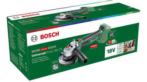 POWER FOR ALL: The battery for your home DIY, Household, GardenBosch Universal Grind 18V-75. Product colour: Black, Green. Grinding disc diameter: 11.5 cm, Idle speed (max): 12000 RPM. Power source: Battery, Battery technology: Lithium-Ion (Li-Ion), Battery voltage: 18 V. Weight: 1.7 kg, Width: 144 mm, Height: 121 mm