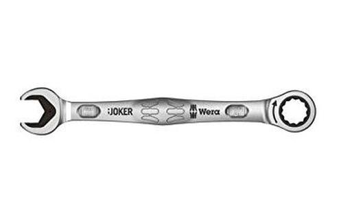 Ratcheting combination wrench; unique holding function, thanks to the metal plate in the jaw, reduces the risk of dropping nuts and bolts; replaceable metal plate in the jaw secures nuts and bolts with its extra hard teeth and reduces the danger of slipping; integrated limit stop prevents any slipping around the bolt head and allows higher torque to be applied; double-hex geometry makes for a positive connection with nuts or bolts and reduces the risk of slipping; return angle of only 30° at the open end to avoid time consuming flipping of the wrench during fastening jobs; ratchet mechanism at the ring end, with an exceptional, fine-tooth mechanism – 80 teeth in all – enables flexibility in very confined working spaces; specially forged geometry for high torque transfer and strength; high performance chrome molybdenum steel; nickel-chrome coating for high corrosion protection. Colour coding and forged dimension details to enable the desired JOKER to be easily located.