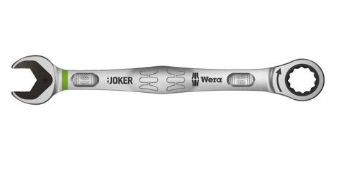 Ratcheting combination wrench; unique holding function, thanks to the metal plate in the jaw, reduces the risk of dropping nuts and bolts; replaceable metal plate in the jaw secures nuts and bolts with its extra hard teeth and reduces the danger of slipping; integrated limit stop prevents any slipping around the bolt head and allows higher torque to be applied; double-hex geometry makes for a positive connection with nuts or bolts and reduces the risk of slipping; return angle of only 30° at the open end to avoid time consuming flipping of the wrench during fastening jobs; ratchet mechanism at the ring end, with an exceptional, fine-tooth mechanism – 80 teeth in all – enables flexibility in very confined working spaces; specially forged geometry for high torque transfer and strength; high performance chrome molybdenum steel; nickel-chrome coating for high corrosion protection. Colour coding and forged dimension details to enable the desired JOKER to be easily located.