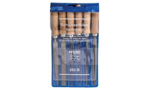 The set contains key files suitable for a selection of different applications.PFERD Key file set with wooden handle 6-piece 100mm cut 2 for delicate filing (265 B). Product type: Files set, File cut type: Cross cut, Suitable for materials: Aluminium, Brass, Cast iron, Cast steel, Copper, Steel, Zinc. Length: 100 mm. Country of origin: Germany