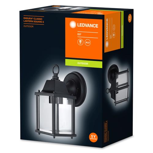 - Patios, balconiesLEDVANCE ENDURA CLASSIC. Type: Outdoor wall lighting, Product colour: Black, Housing material: Aluminium. Fitting/cap type: E27, Number of bulbs: 1 bulb(s), Replacement bulb power (max): 60 W. Power source type: AC, Input voltage: 220 - 240 V, AC input frequency: 50 / 60 Hz. Width: 105 mm, Depth: 150 mm, Height: 225 mm. Quantity per pack: 1 pc(s), Package width: 171 mm, Package depth: 131 mm