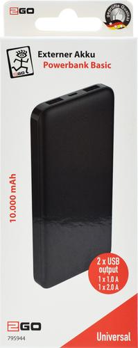 2GO 795944. Battery capacity: 10000 mAh, Battery technology: Lithium Polymer (LiPo). USB Type-A output ports: 2. Product colour: Black