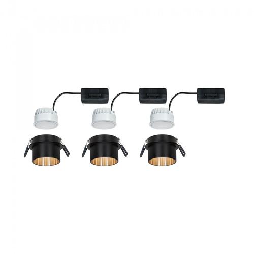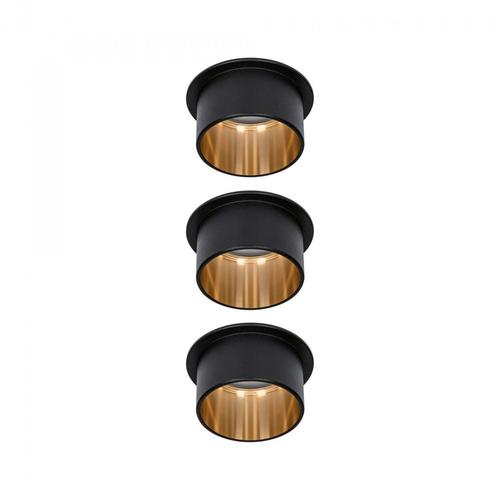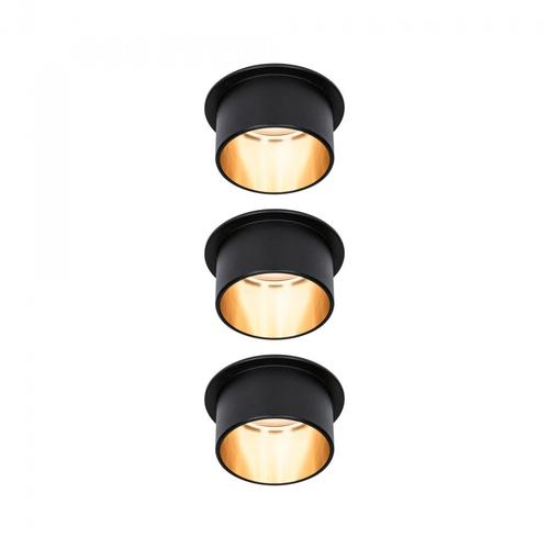 With its two-tone design, the decorative Gil recessed luminaire 3-piece set in Black matt/Gold makes for a real lighting highlight and sets glare-free accents on the ceiling. The protruding decorative cylinder requires a shallower installation depth than the recessed light points. Once you see it, you won’t want to look away The spotlights score points with brilliant technology: The replaceable LED coins provide pleasant warm white light, can be dimmed in three steps using a conventional light switch and can be chained together in an unlimited number. They require a bore of 62 mm.Paulmann Gil Coin. Product type: Surfaced lighting spot, Suitable for indoor use, Plafond shape: Round. Number of bulbs: 1 bulb(s), Bulb type: LED, Total power: 6 W, Colour temperature (max): 2700 K, Luminous flux: 470 lm. International Protection (IP) code: IP44. Dimmable. Input voltage: 230 V. Product colour: Black, Gold