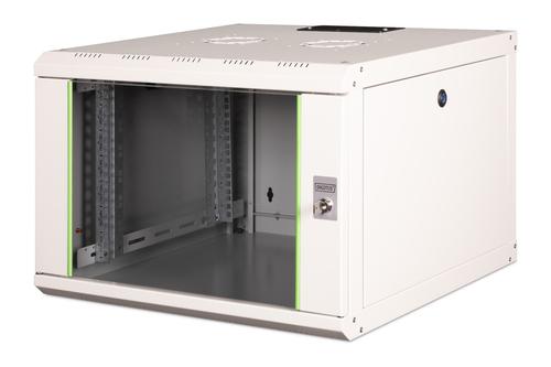 The network cabinets for wall installation from the Unique series were developed for especially convenient and flexible network cabling. There is a sliding cable inlet with foam rubber seal in the roof of each cabinet. The back wall and floor plate are equipped with pre-cut cable inlets with a plastic cover. To accommodate a fan module, the roof structure is also equipped with a pre-cut area. Two pair of galvanized 483 mm (19”) profile rails labeled with rack units readable in both directions are installed on the inside. Their depth can be adjusted. Each cabinet is made of up to 1.5 mm thick sheet steel. Coloring is done with electrostatic powder coating in the standard colors gray (RAL 7035) or jet black (RAL 9005). Removable and lockable side walls in a modular design as well as lockable and removable front door improve accessibility. The door hinges can be switched. Wall installation is accomplished in two easy work steps: The housing frame plate is bolted on the wall and then connected with the housing. With optionally available levelling feet or casters, the wall housings from the Unique series can also be used as a free-standing unit.Digitus Wall Mounting Cabinet Unique Series - 600x600 mm (WxD). Type: Wall mounted rack, Rack capacity: 7U, Maximum weight capacity: 100 kg, International Protection (IP) code: IP20, Product colour: Grey