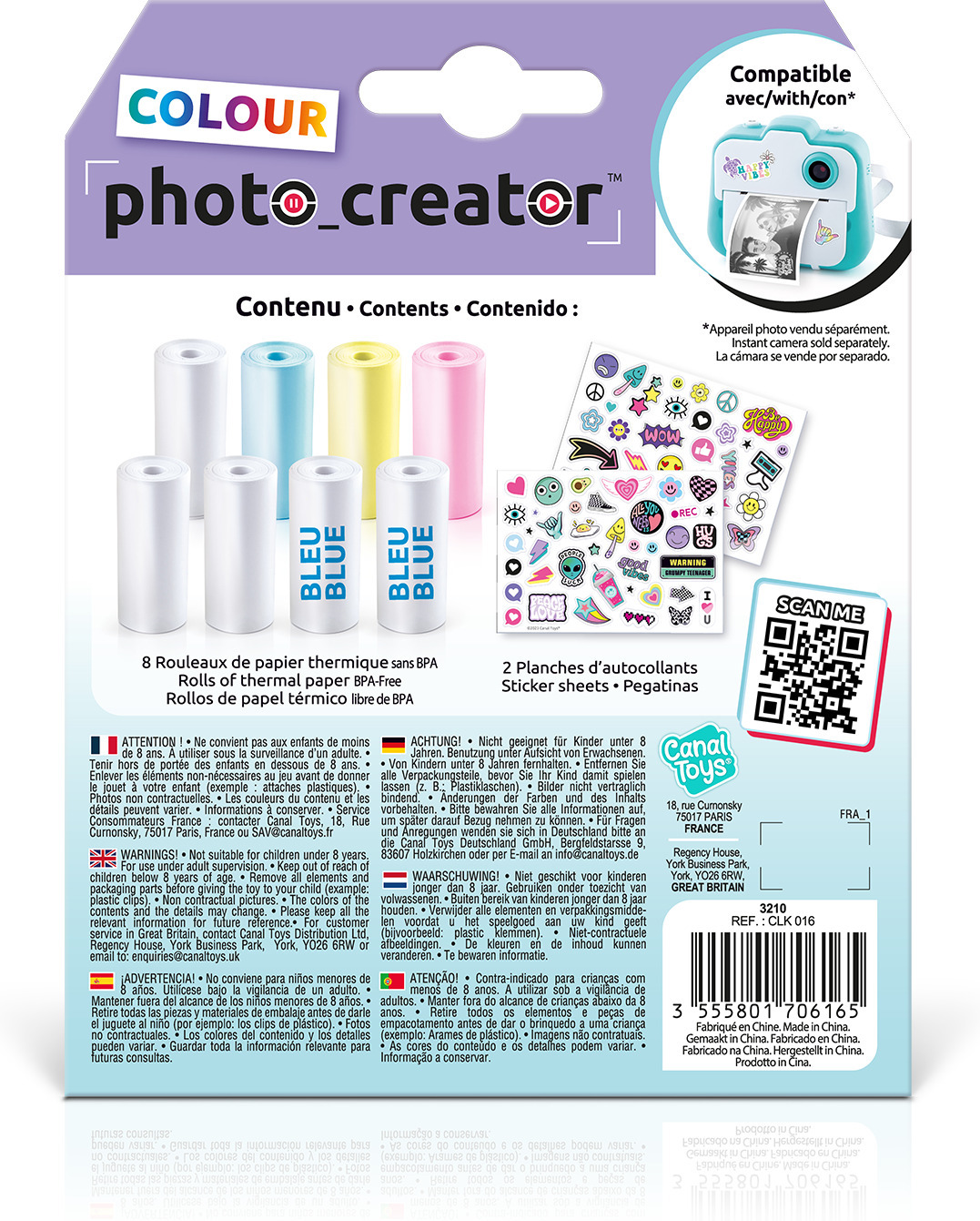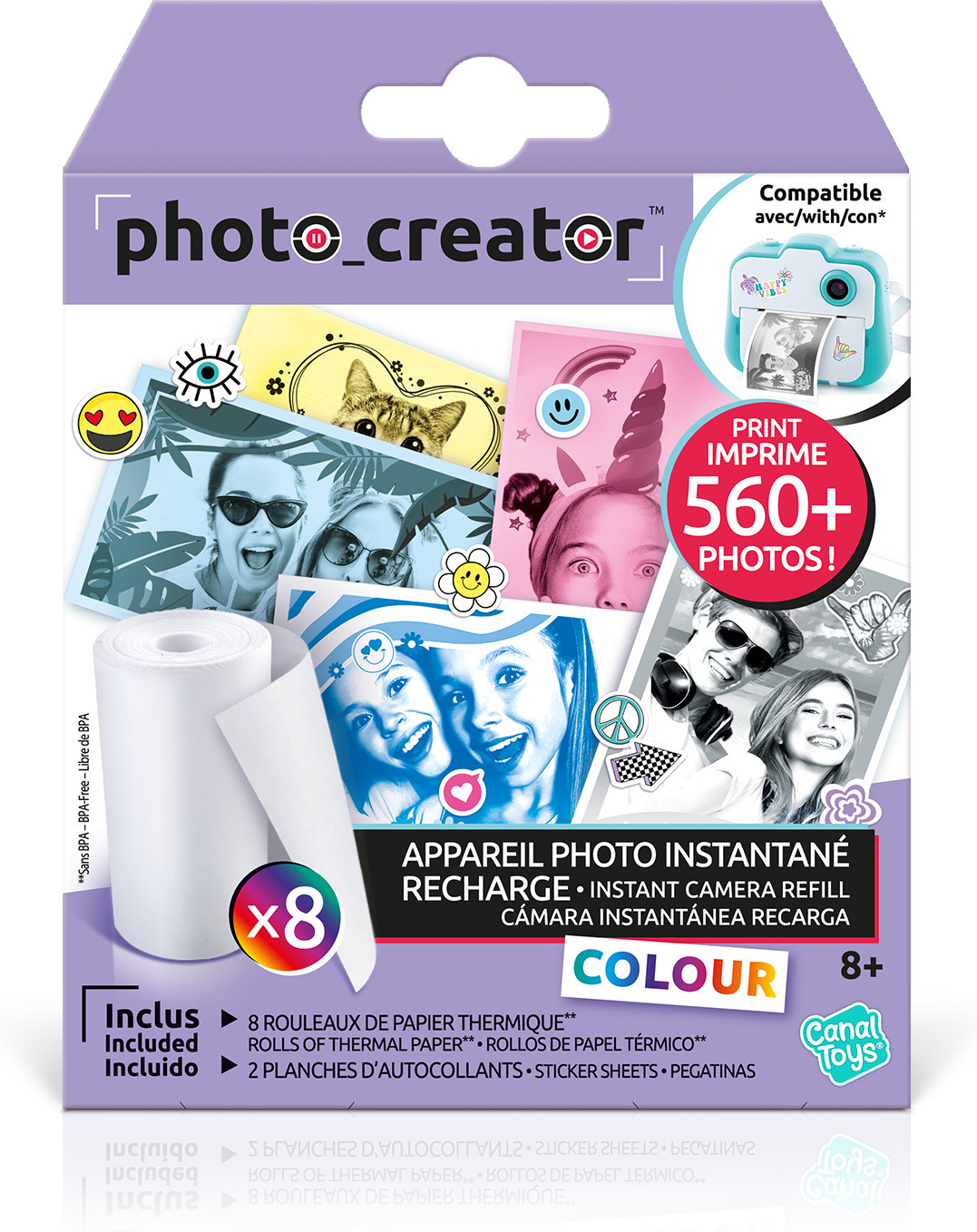 8 photo paper roll refill kit for Photo Creator Instant camera. Includes white rolls, colour rolls and rolls for printing coloured images (pink and blue). The rolls are also suitable for the Instant Pocket Printer.