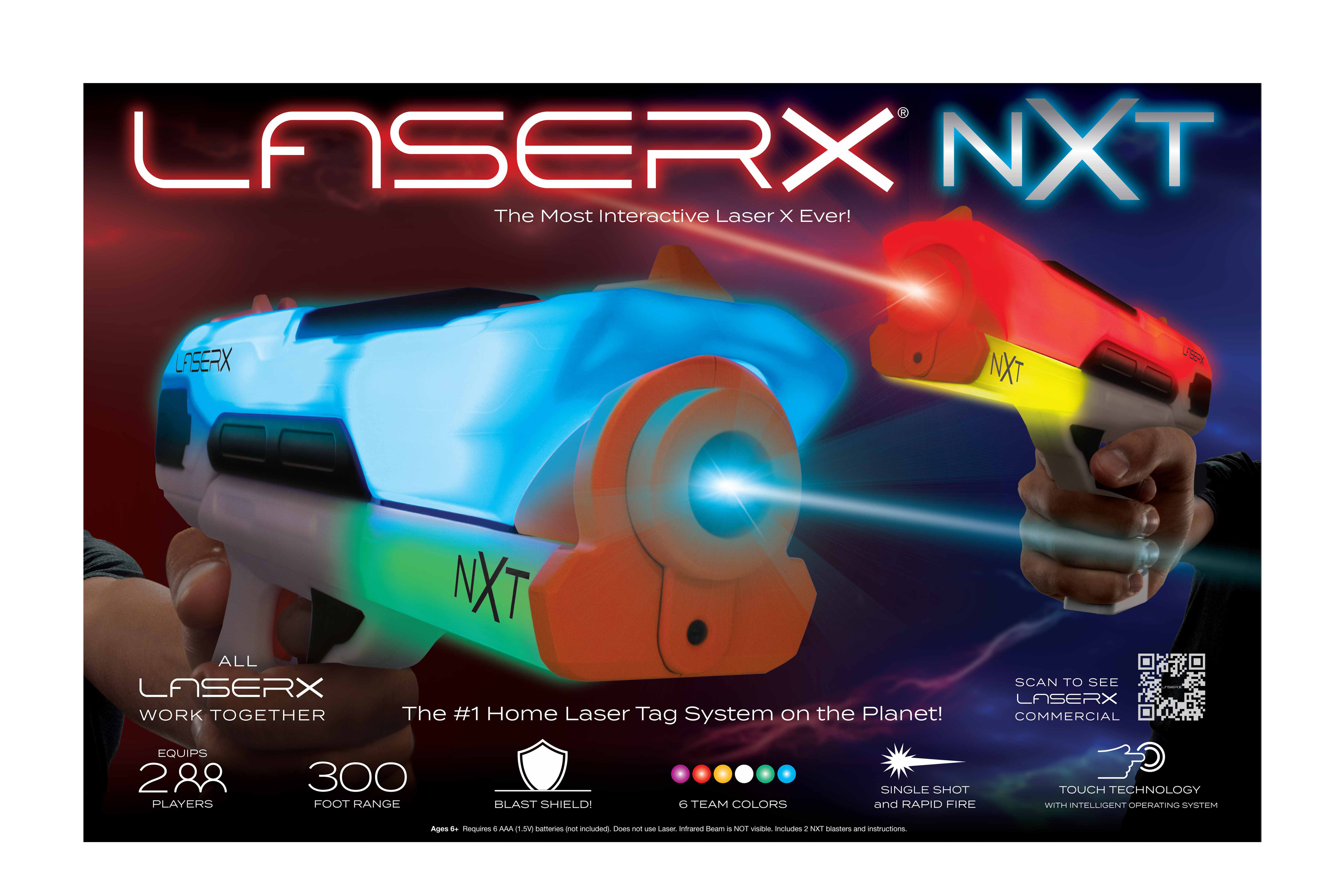 NXT blasters come to life with visual spatial cues - joining the LaserX game couldn't be easier. Create a team with your friends who also have LaserX guns and engage in a battle of teams of different colours - see who wins! LaserX NXT guns work with all other LaserX blasters.