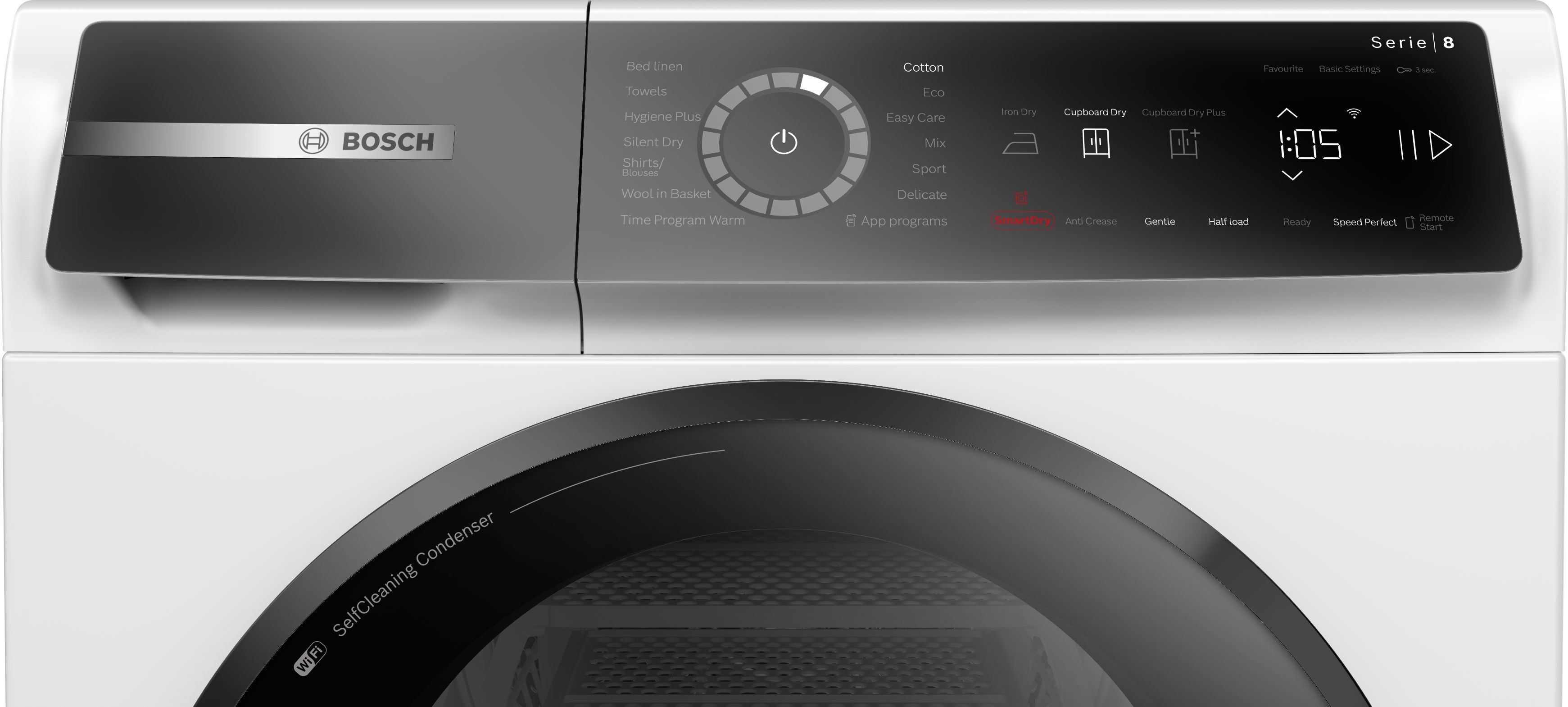 Smart Dry yhdistää kuivausrummun ja pesukoneen Wi-Fi-yhteydellä, jolloin kuivausohjelma valitaan automaattisesti pesun mukaan. Home Connect -sovelluksella kuivausrumpua voi ohjata etänä, seurata energiankulutusta ja ladata uusia ohjelmia. Smart Start -toiminnolla laitteen voi käynnistää silloin, kun sähkön hinta on alhaisin, mikä auttaa säästämään energiaa ja rahaa.