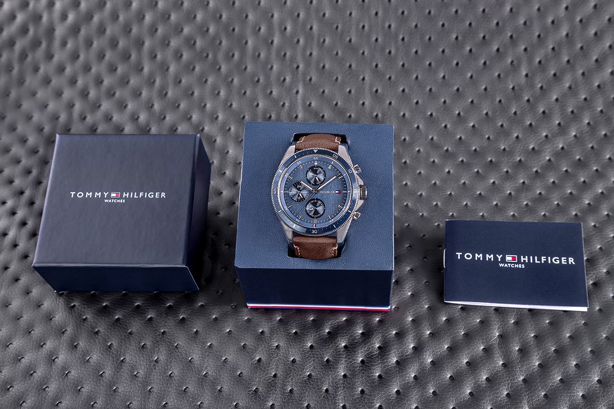 Product description: • Brand: Tommy Hilfiger • Reference: 1791837 • Model: Parker • Movement: Quartz • Dial: Analog with chronograph sub-dials (12/24-hour format) and day/date display (day of the week and day of the month) • Case: Stainless steel • Crystal: Mineral glass • Strap: Genuine leather • Features: Luminescent hour markers and hands • Water resistance: 50 m (5 bar) • Hypoallergenic: Yes — nickel-free • Case diameter: 44 mm • Dial diameter: 37 mm • Thickness: 11 mm • Strap width: 22 mm • Wrist circumference: max. 210 mm Colorway: • Case: silver • Dial: metallic navy • Hour markers: silver with luminescent coating • Hands: silver with luminescent coating • Seconds hand: black • Strap: brown leather with white stitching