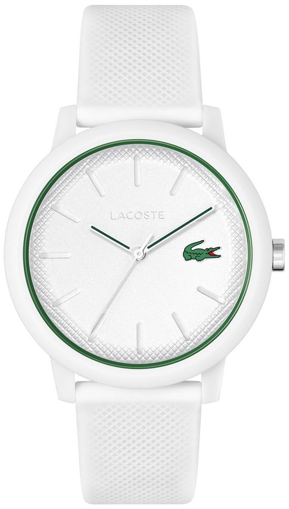 Product description: • Brand: Lacoste • Reference: 2011156 • Model: LACOSTE 12.12 • Movement: Quartz • Dial: Analog • Case: Plastic • Crystal: Mineral glass • Strap: Plastic • Features: None • Water resistance: 50 m (5 bar) • Hypoallergenic: Yes — nickel-free • Case diameter: 42 mm • Dial diameter: 35 mm • Thickness: 10 mm • Strap width: 20 mm • Wrist circumference: max. 210 mm Colorway: • Case: white • Dial: white with green edge • Logo on the dial: green • Hour markers: white • Hands: white and green • Seconds hand: white • Strap: white • Crown: silver