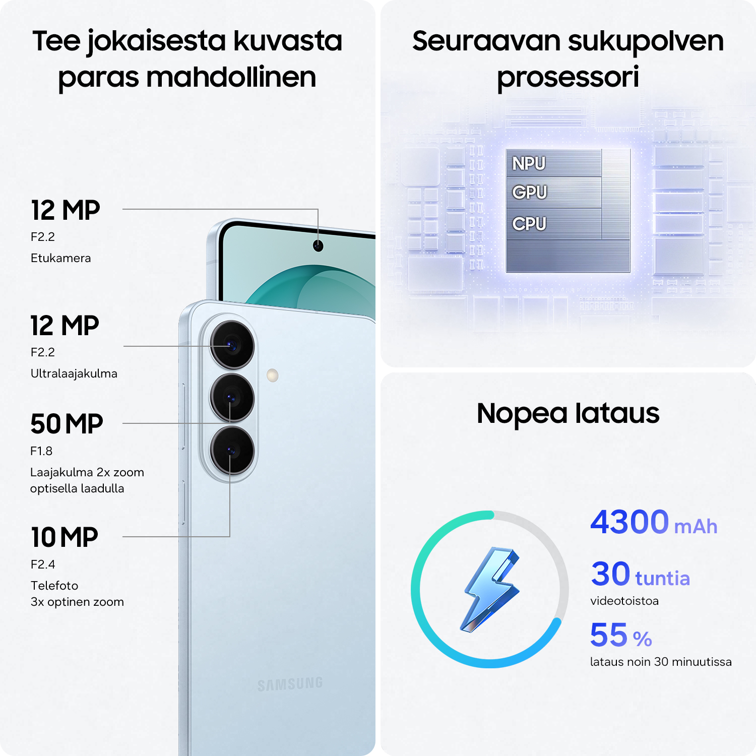 Samsung Galaxy S26 tarjoaa AI‑pohjaisia toimintoja, jotka helpottavat arkea ja tekevät puhelimen käytöstä vaivatonta. Se ehdottaa sopivia lähtöaikoja, auttaa valinnoissa ja tukee päivittäisiä rutiineja ilman monimutkaisia asetuksia. Kamerajärjestelmä tallentaa yksityiskohdat tarkasti erilaisissa olosuhteissa, ja laitteen laitteisto on rakennettu varmistamaan sulava suorituskyky. Puhelimessa on kestävä rakenne, selkeä näyttö ja ominaisuudet, jotka tekevät käytöstä sujuvaa sekä työssä että vapaa‑ajalla.