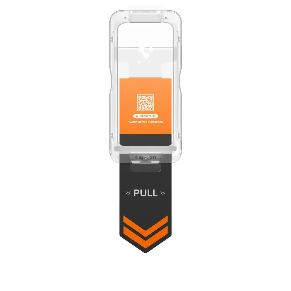 Spigen Glas.tR "EZ Fit Pro" tempered glass is a high-quality screen protector with a convenient EZ Fit Pro mounting system that allows for quick, precise, and hassle-free application without bubbles or slippage. It consists of multiple layers, including an oleophobic coating to reduce fingerprints, a protective layer to absorb impacts, and tempered glass with a 9H hardness that effectively protects the screen from scratches and damage. It maintains full transparency and touch sensitivity without affecting the comfort of everyday use. Perfectly fitted and compatible with Spigen cases, it provides reliable and aesthetically pleasing screen protection. * The glass/foil is cut exclusively to fit the flat, curved portion of the display, in accordance with the die cut provided by the manufacturer of the specific phone model. Only this cut ensures full compatibility with our protective accessories.