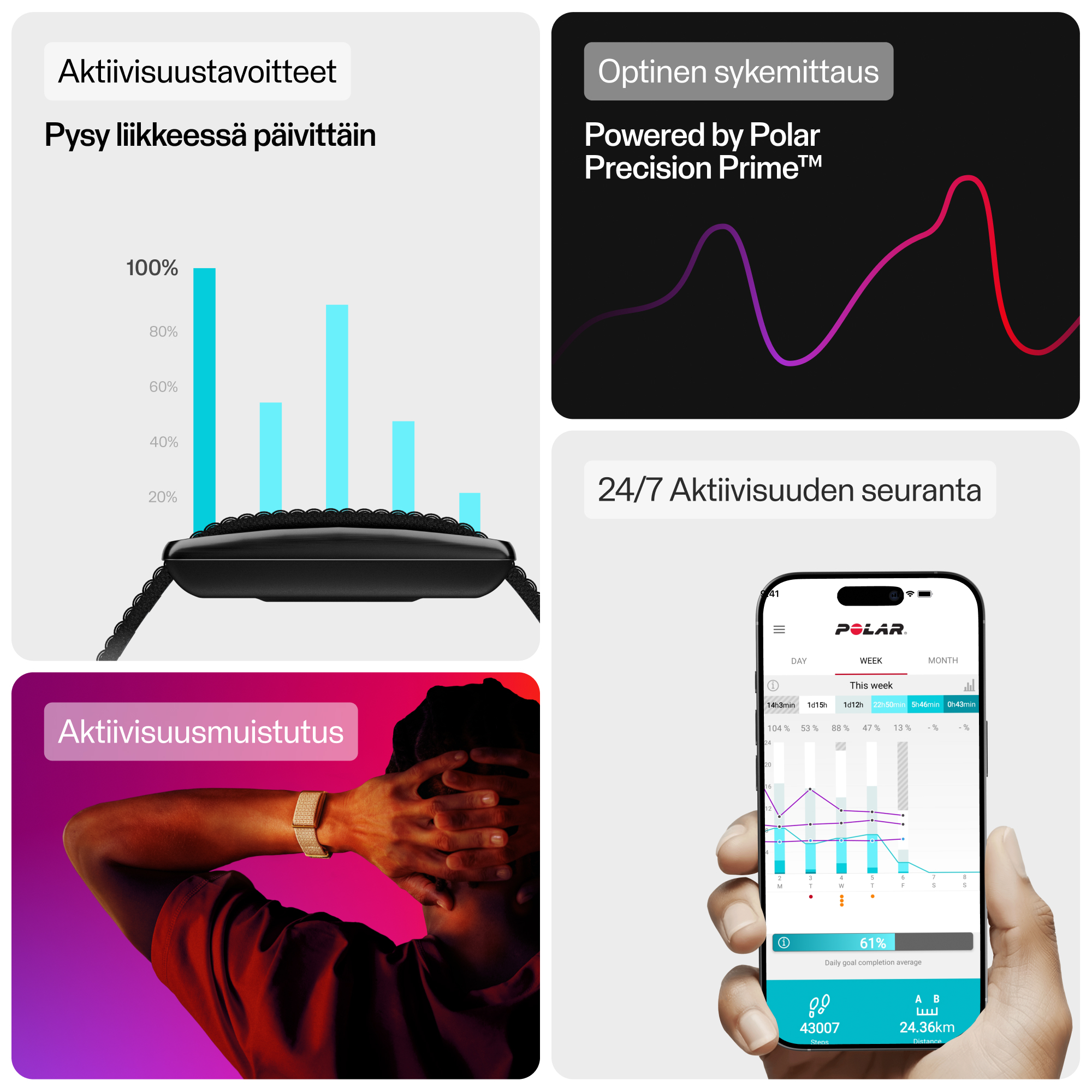 Polar Precision Prime™ tehnoloogia pakub täpset optilist pulssimõõtmist, mis põhineb teaduslikel uuringutel. Seadme mälli mahutab kuni 4 nädala andmed ja see sünkroonib andmed automaatselt Polar Flow rakendusega Bluetooth 5.1 ühenduse kaudu. Seade on veekindel kuni 30 meetrini ja laadub USB-C kaabliga.