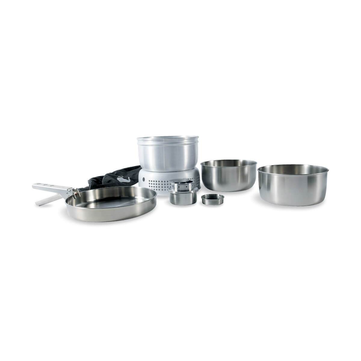 Tatonka Multi Set sisaldab kõiki olulisi esemeid telgis toiduvalmistamiseks. Lisaks pannile, kahele potile ja potihoidjale on komplektis stabiilne pliidi alus, tuulekett ja põleti kuumuse reguleerimisega. Komplekti eri osad töötavad hästi koos ja võimaldavad valmistada erinevaid roasid lihtsatest suppidest praetud delikatessideni.