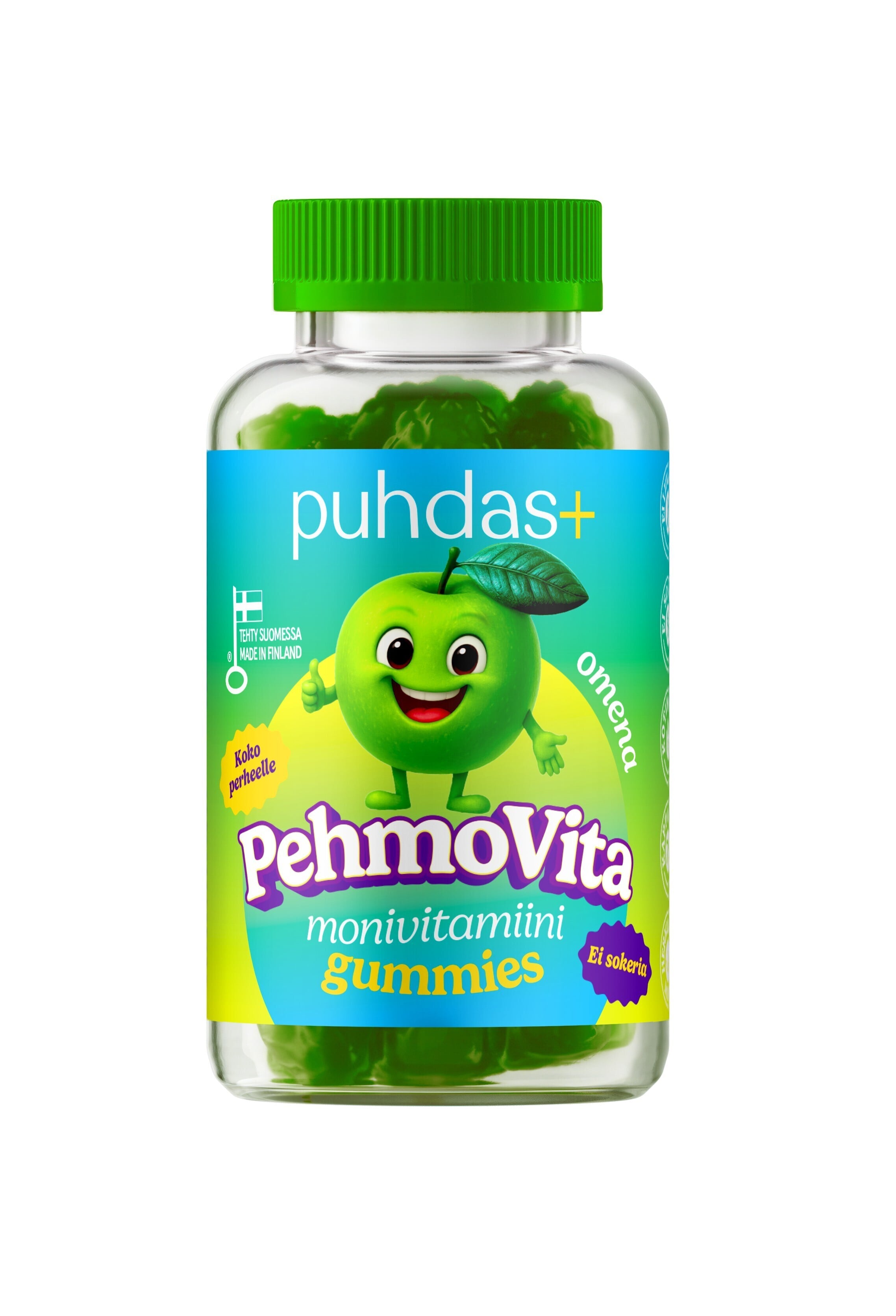 Puhdas+ PehmoVita Apple on maitsev õunaga maitsestatud multivitamiin, mis on valmistatud Soomes ja sobib nii lastele kui tervele perele. Pehme ja maitsev komme muudab vitamiinide võtmine lihtsaks ja lõbusaks, ilma suhkru ja kunstlike maitsetajate lisamisega.