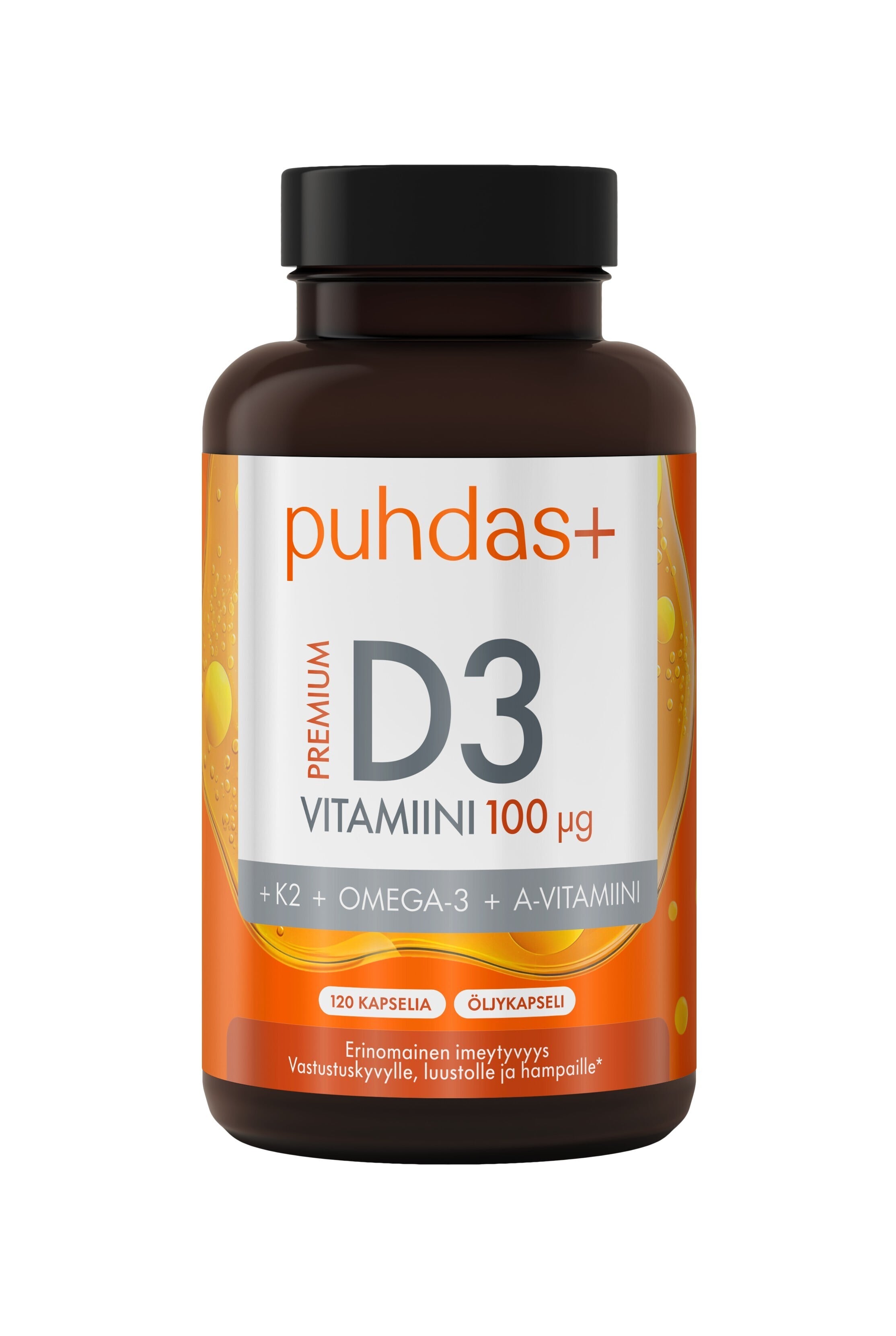 Puhdas+ Premium D3-vitamiin on mitmekülgne ja kergesti imenduv vitamiinipreparaat, mis ühendab D3-, K2- ja A-vitamiinid omega-3 rasvhapetega ühes kapslis. Ideaalne valik, kui soovite toetada oma keha tervist lihtsalt ja efektiivselt.