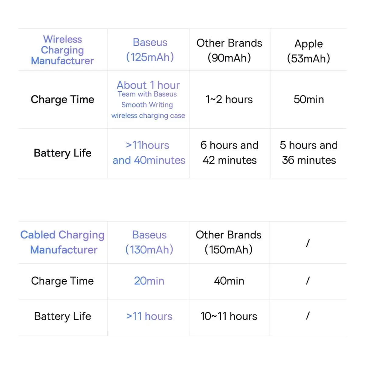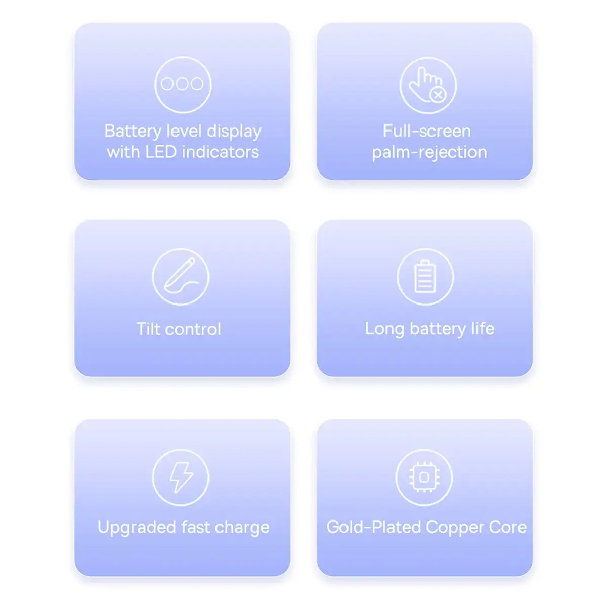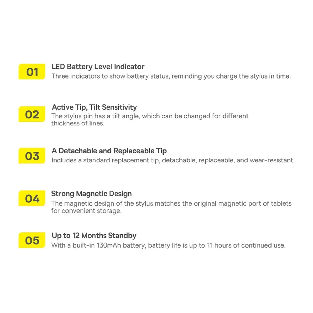 Active stylus for iPad Baseus Smooth Writing 2 SXBC060402 - white The iPad experience becomes smoother and more enjoyable than ever before! Thanks to the Baseus stylus, you can enjoy having an aesthetic and reliable accessory that perfectly fits your needs. Performing everyday activities such as writing or drawing will not cause you any problems. The stylus supports writing at different angles: 45°, 60 ° and 90°, which affects the precision and thickness of the line. You write without any disruptions, and the stylus leaves a perfectly even mark on the screen. Specification: Brand: Baseus Model: SXBC060402 White color Usage time: working mode: up to 11h standby: up to 12 months Battery capacity: 130mAh Charging time: about 1 hour Charge indicator: 3 LEDs Stylus core: gold-plated copper Material: aluminum alloy + POM plastic Set contains: 1 x stylus 1 x USB-C 3A 0.25m cable 1 x active tip Compatibility: iPad model name Release date Model codes Wireless charging support iPad Pro 12.9'' 6th gen. 2022 A2436, A2764, A2437, A2766 Yes iPad Pro 12.9'' 5th gen. 2021 A2378, A2461, A2379, A2462 Yes iPad Pro 12.9'' 4th gen. 2020 A2229, A2069, A2232, A2233 Yes iPad Pro 12.9'' 3rd generation 2018 A1876, A2014, A1895, A1983 Yes iPad Pro 11'' 4th gen. 2022 A2759, A2435, A2761, A2762 Yes iPad Pro 11'' 3rd gen. 2021 A2377, A2459, A2301, A2460 Yes iPad Pro 11'' 2nd gen. 2020 A2228, A2068, A2230, A2231 Yes iPad Pro 11'' 1st gen. 2018 A1980, A2013, A1934, A1979 Yes iPad Air 5th gen. 2022 A2588, A2589, A2591 Yes iPad Air 4th gen. 2020 A2316, A2324, A2325, A2072 Yes iPad Air 3rd gen. 2019 A2152, A2123, A2153, A2154 NO iPad mini 6th generation 2021 A2567, A2568, A2569 Yes iPad mini 5th generation 2019 A2133, A2124, A2126, A2125 NO iPad 10.9'' 10th gen. 2022 A2696, A2757, A2777 NO iPad 10.2'' 9th gen. 2021 A2602, A2604, A2603, A2605 NO iPad 10.2'' 8th gen. 2020 A2270, A2428, A2429, A2430 NO iPad 10.2'' 7th gen. 2019 A2197, A2198, A2200 NO iPad 9.7'' 6th generation 2018 A1893, A1954 NO The most important features: Line width changes with pressure when tilting Removable and replaceable tip and pen cap Standby time up to 12 months The set includes 1 active tip Capacitive tip for operating touch screens Battery charge indicator